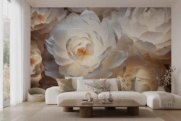Fotomurales Grandes flores de peonía blancas con centros amarillos, iluminación suave y pétalos delicados con textura en capas. Nr. w09550