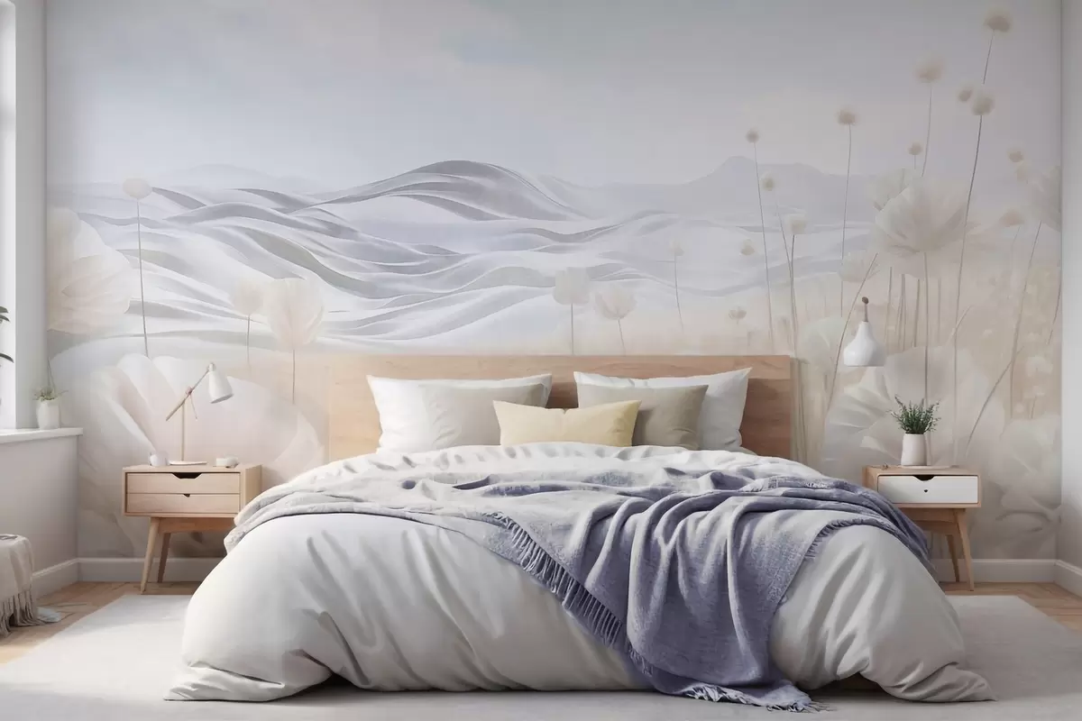 Fotomurales Campo texturizado de amapolas cremosas con colinas onduladas bajo un cielo azul pálido con nubes suaves, colores pastel. Nr. w09553