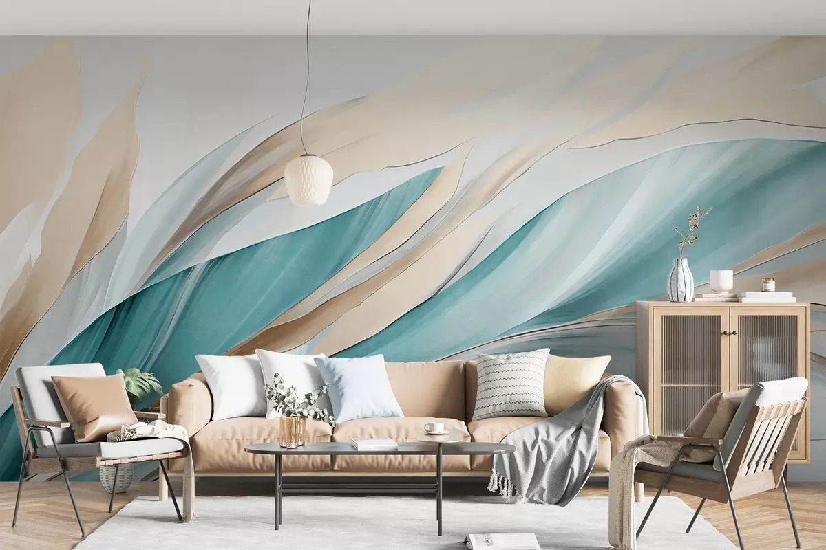 Fotomurales Ondas abstractas fluidas de color verde azulado y amarillo, con formas y líneas finas, sobre un fondo blanco, arte texturizado. Nr. w09585