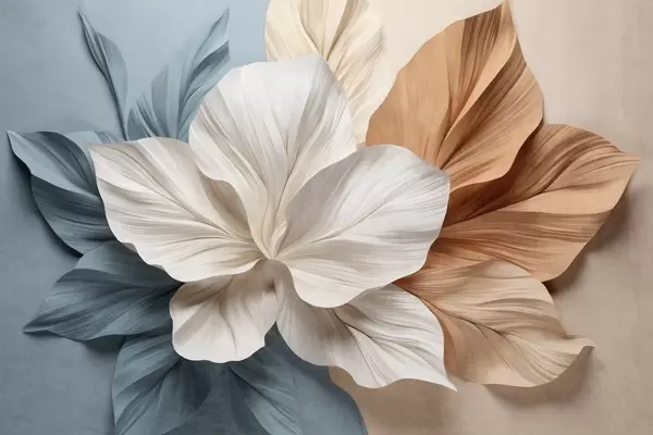 Fotomurales Flor abstracta de múltiples pétalos con hojas texturizadas en tonos melocotón y azul, fondo suave. Nr. w09604