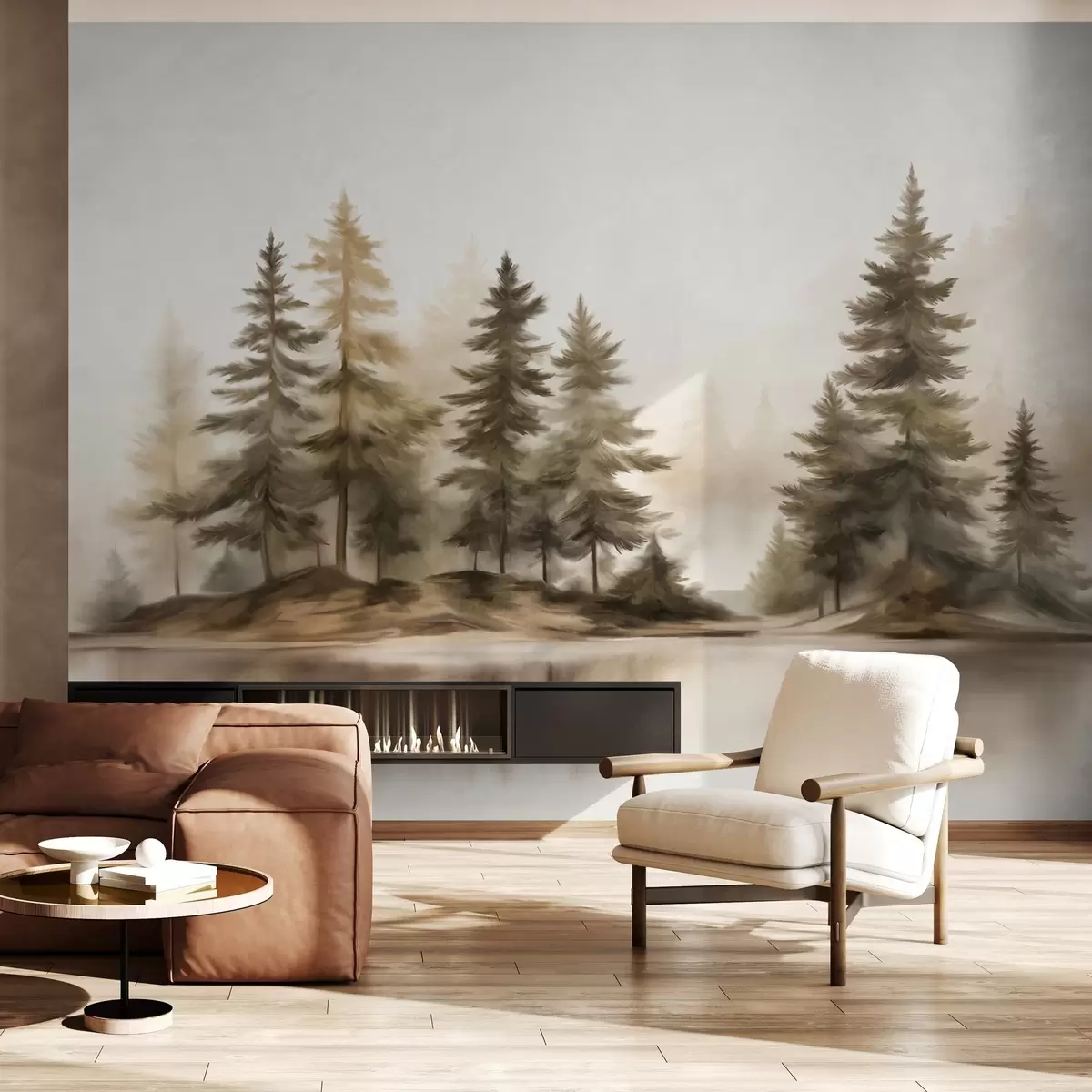 Fotomurales Un bosque brumoso con textura y altos pinos pintados de imitación. Nr. w09610