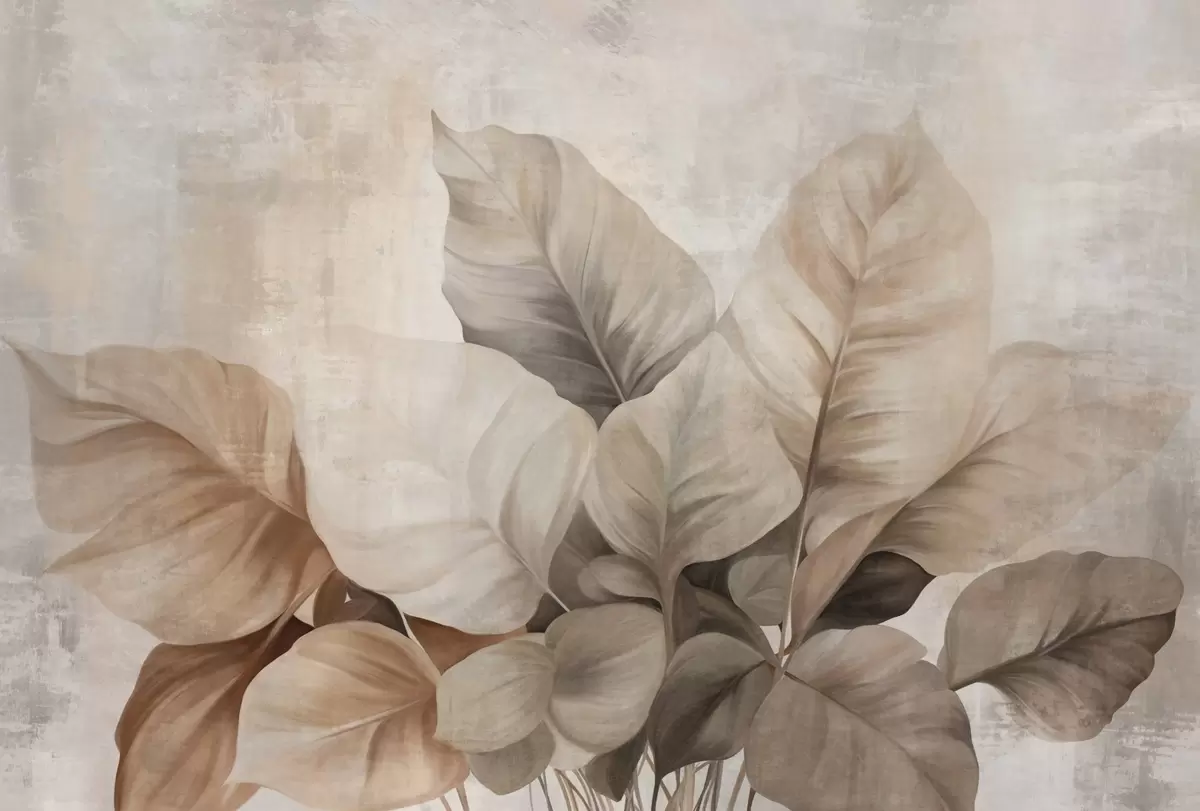Fotomurales Imitacione de pintura texturizada de hojas grandes de color marrón claro sobre un fondo neutro con pinceladas sutiles. Nr. w09614