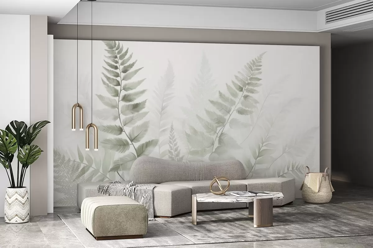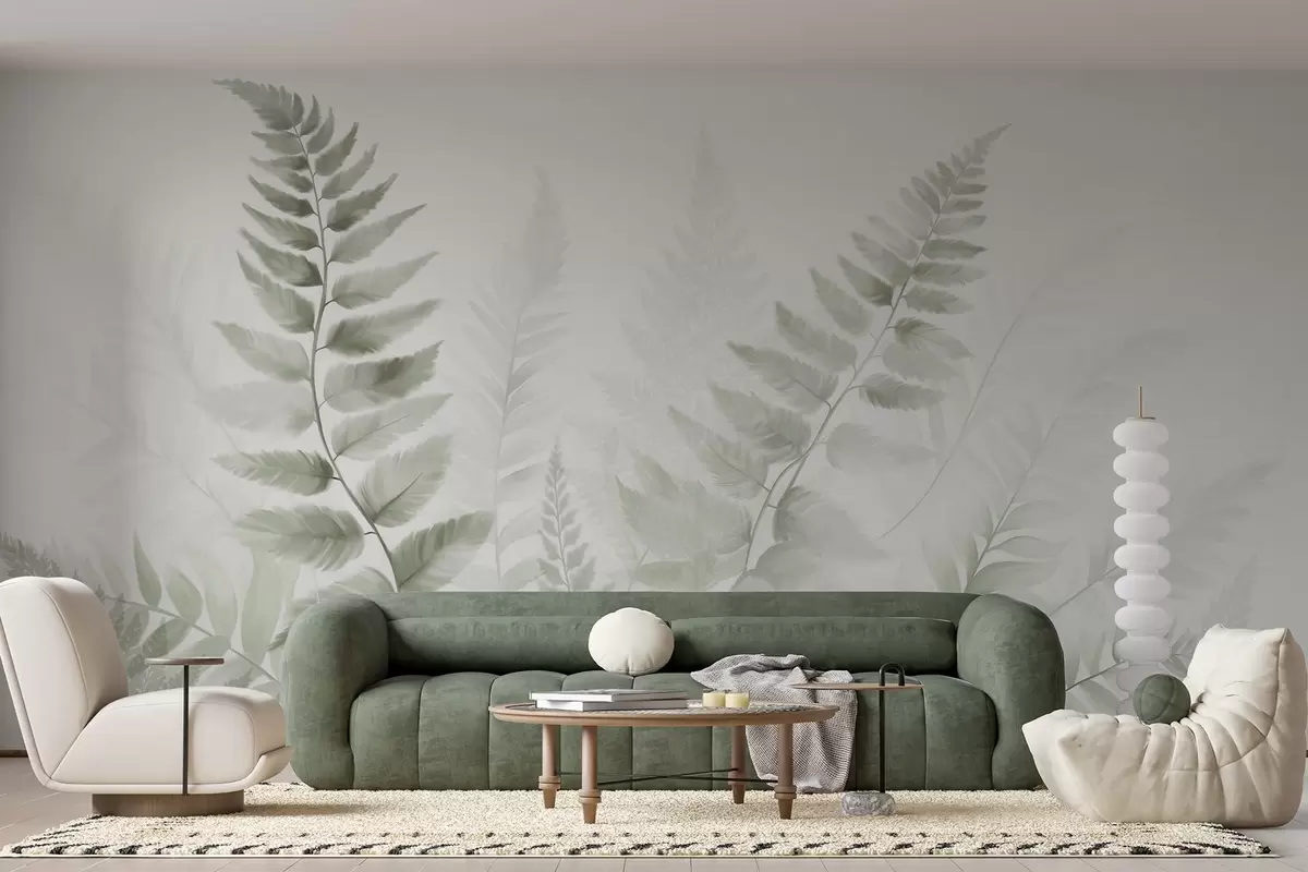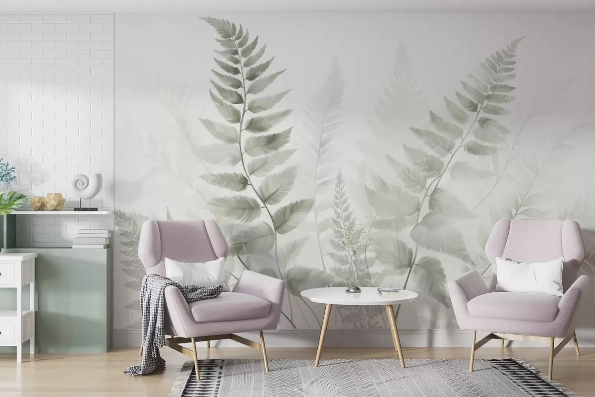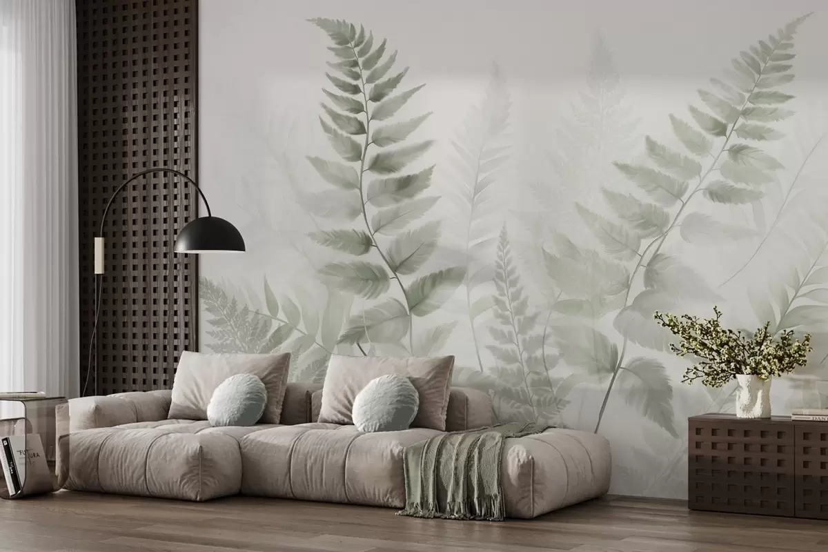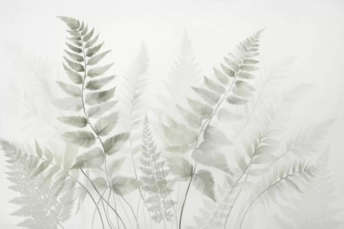Fotomurales Hojas secas de helecho con textura en varios tonos de verde, con un fondo suave y claro en estilo acuarela. Nr. w09615v1