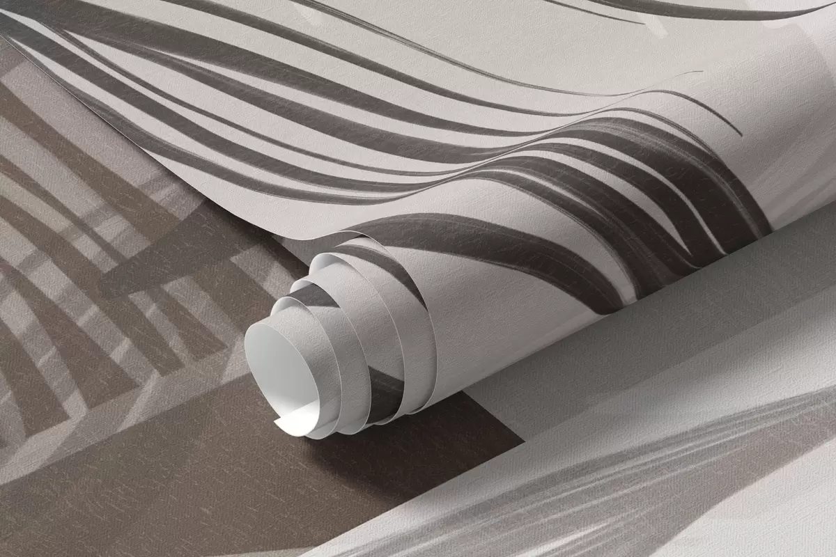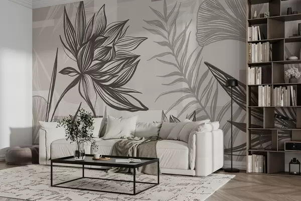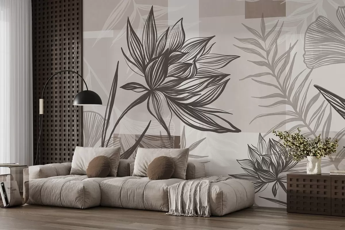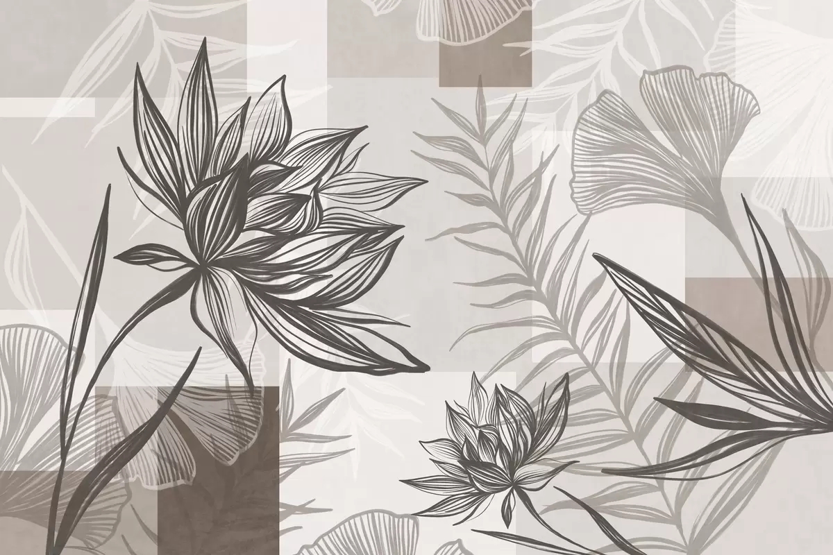 Fotomurales Flores y hojas estilizadas con textura en tonos marrones y beige, con un fondo geométrico, arte lineal. Nr. w09629