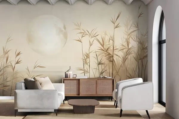 Fotomurales Paisaje texturizado con altos juncos, lago y luna pálida en un cielo brumoso. Nr. w09631