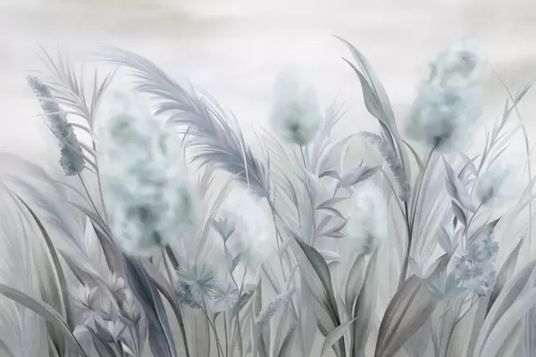 Fotomurales Hierba de la pampa rosa y beige y otras flores secas con un cielo suave y brumoso al fondo. Nr. w09635