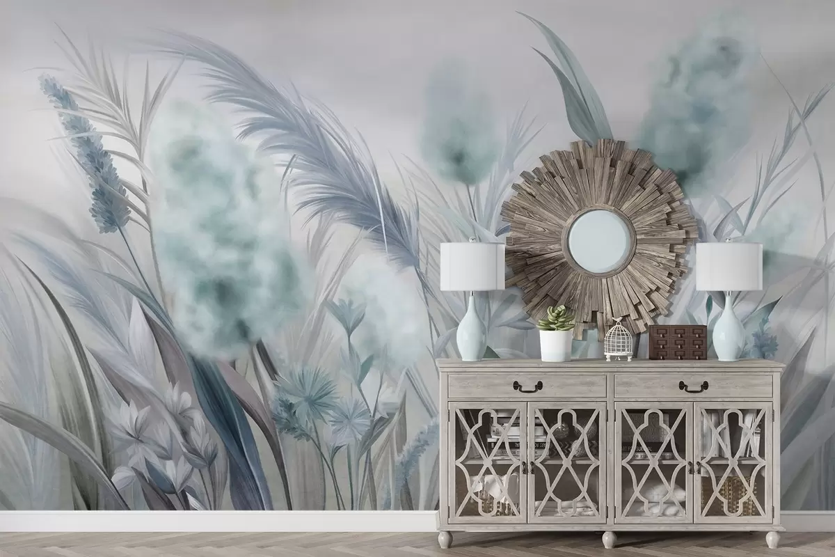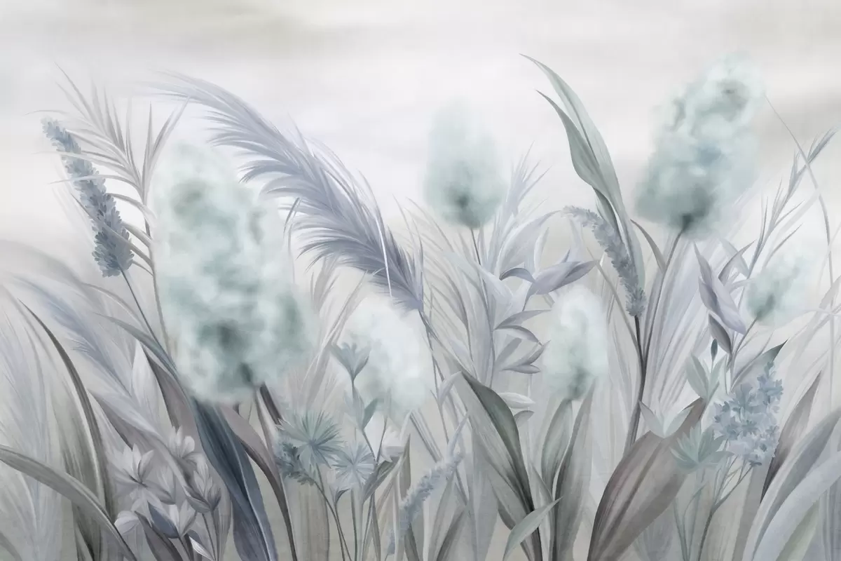 Fotomurales Hierba de la pampa azul y gris y otras flores secas con un cielo suave y brumoso al fondo. Nr. w09635v1