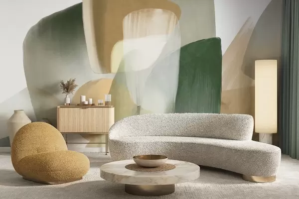 Fotomurales Formas abstractas con textura en colores verde y beige apagados, con bordes suaves y capas superpuestas. Nr. w09642