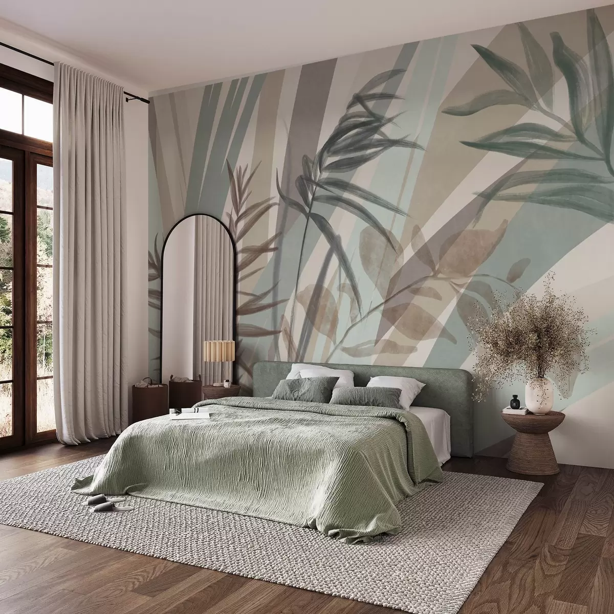 murales de pared Hierba alta con textura y hojas en tonos tierra apagados, con líneas abstractas en el fondo, creando un estampado orgánico. w09643
