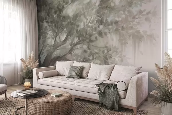Fotomurales Árbol texturizado con hojas y ramas de color verde claro, con un fondo suave y difuminado. Nr. w09650