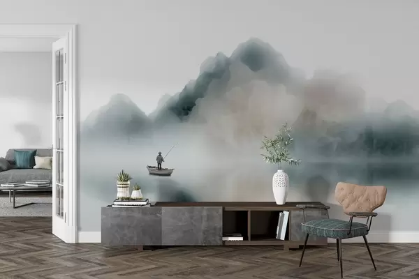 Fotomurales Paisaje montañoso con un barco y un pescador que se desvanecen en una suave niebla Nr. w09678