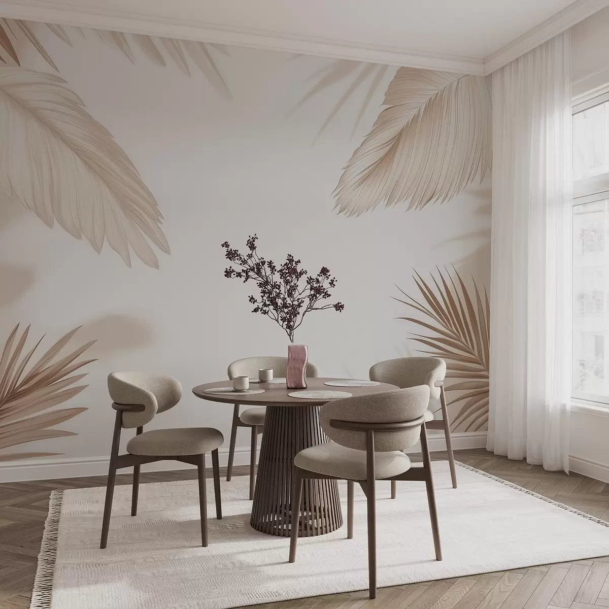 Fotomurales Decoración tropical en tonos beige con siluetas de hojas de palmera y sombras suaves Nr. w09714
