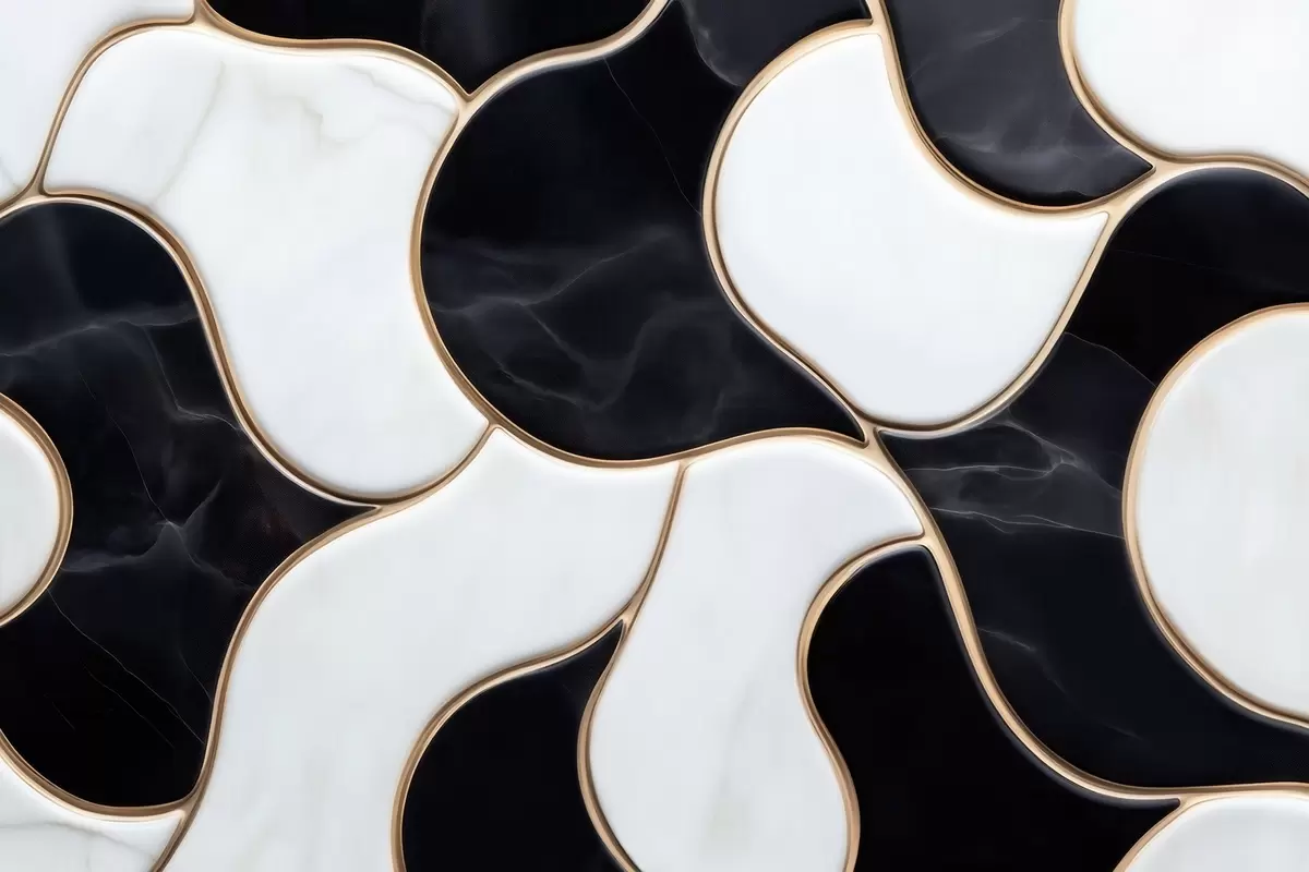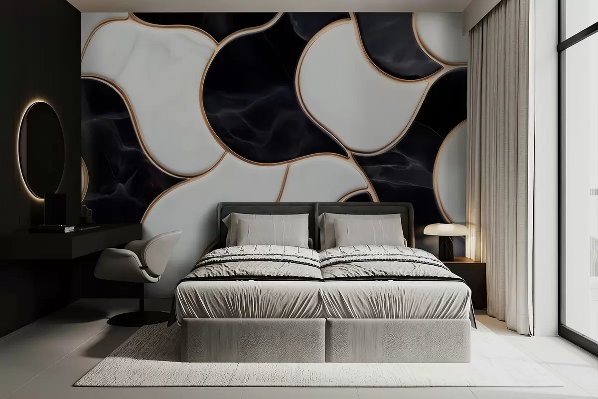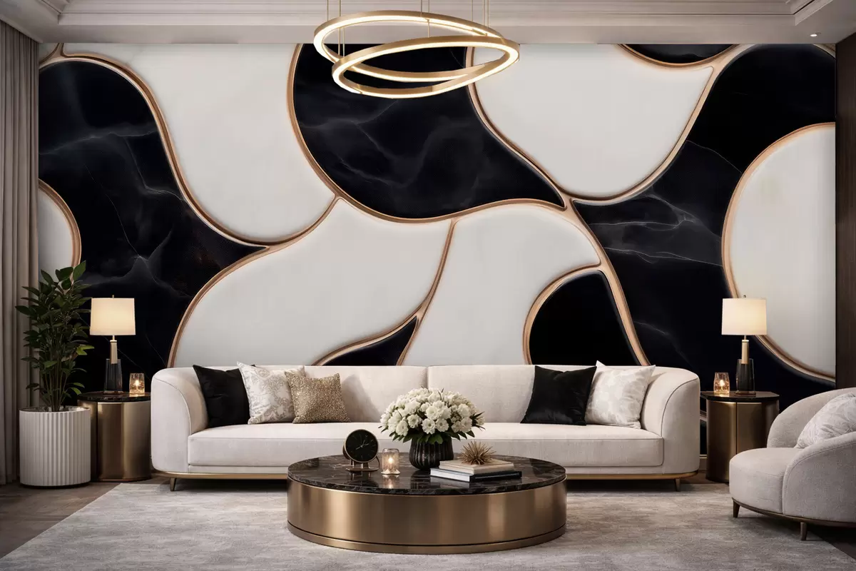 Fotomurales Imitación abstracta de una composición de mármol en tonos blancos y negros con líneas amarillas Nr. w09733