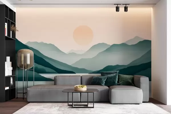 Fotomurales Tranquilo paisaje montañoso con el sol sobre el lago Nr. w09735