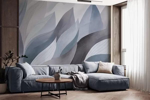 Fotomurales Hojas abstractas, tonos tierra apagados en azul con delicados detalles lineales, textura suave de acuarela. Nr. w09736v1
