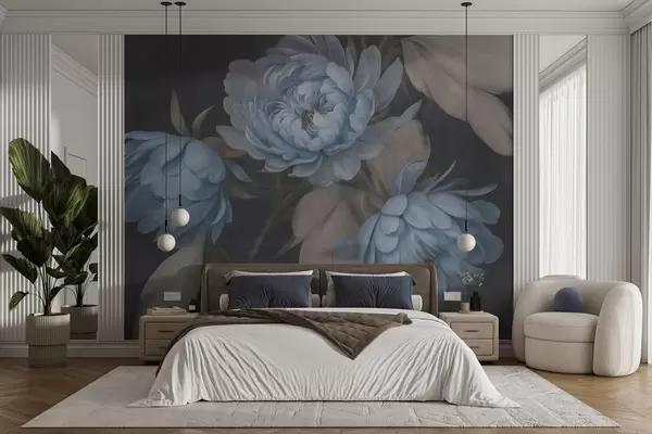 Fotomurales Flores de peonía azul claro con textura y hojas de color beige sobre un fondo oscuro Nr. w09751
