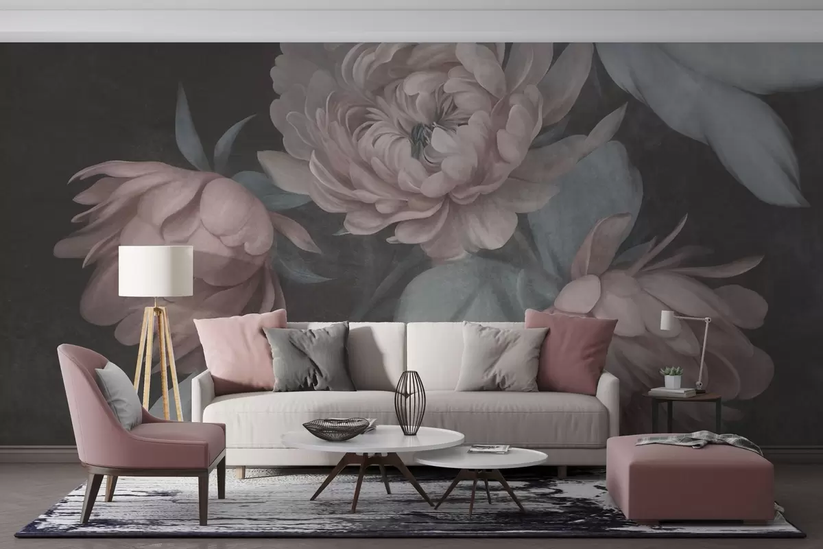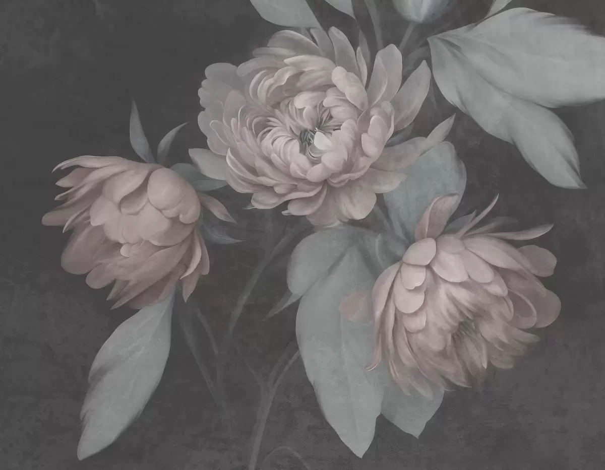 Fotomurales Flores de peonía de color rosa claro con textura y hojas de un verde apagado sobre un fondo oscuro Nr. w09751v1