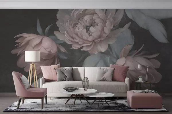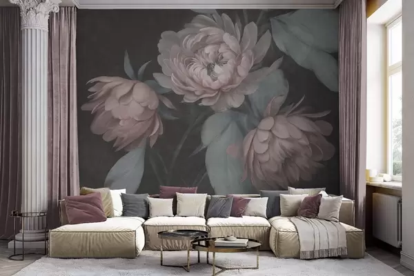 Fotomurales Flores de peonía de color rosa claro con textura y hojas de un verde apagado sobre un fondo oscuro Nr. w09751v1