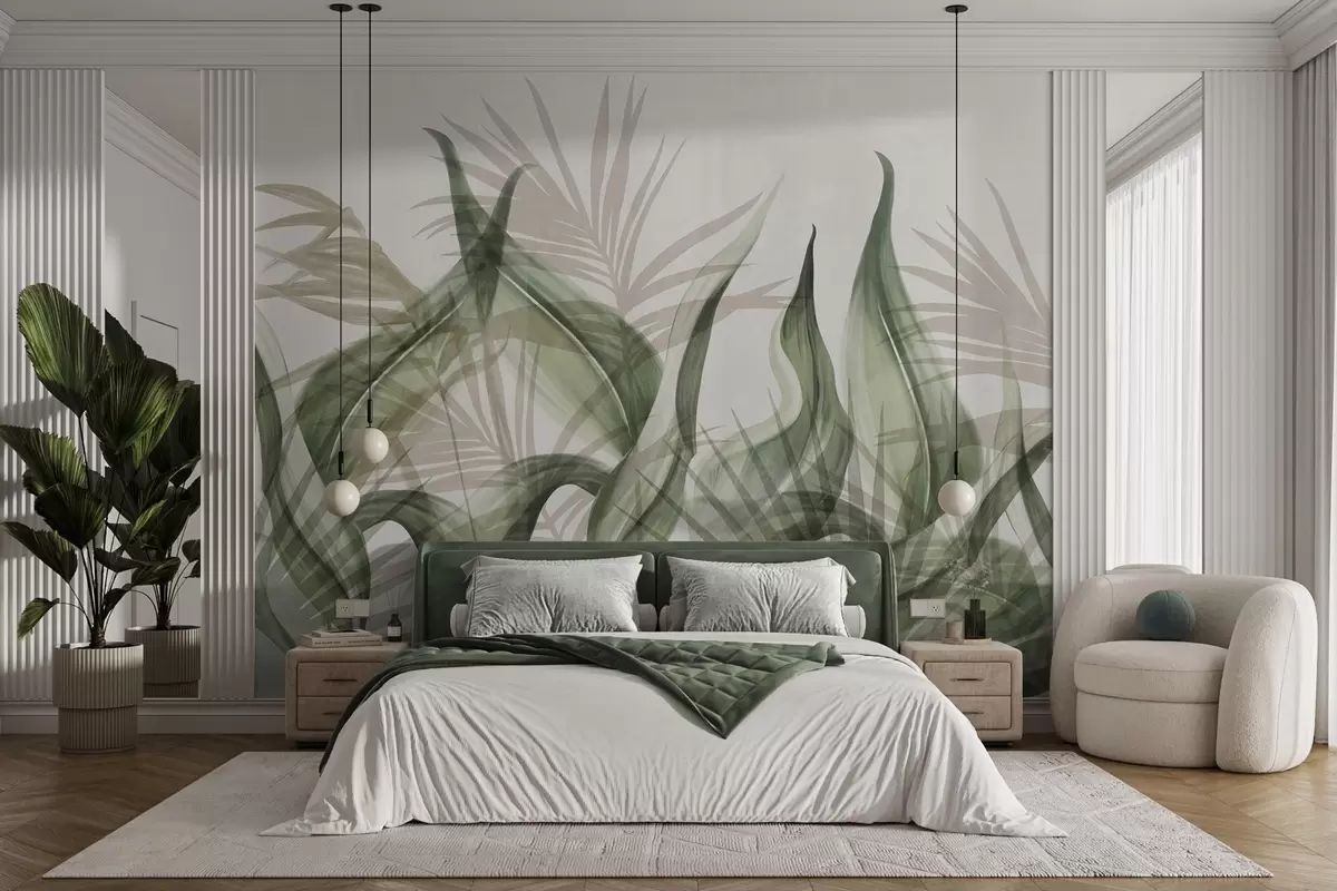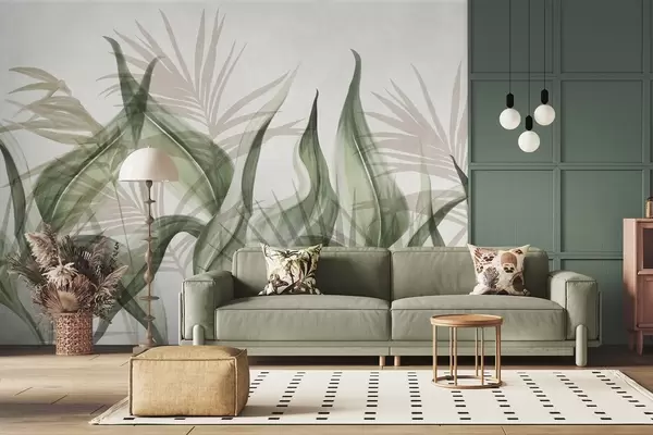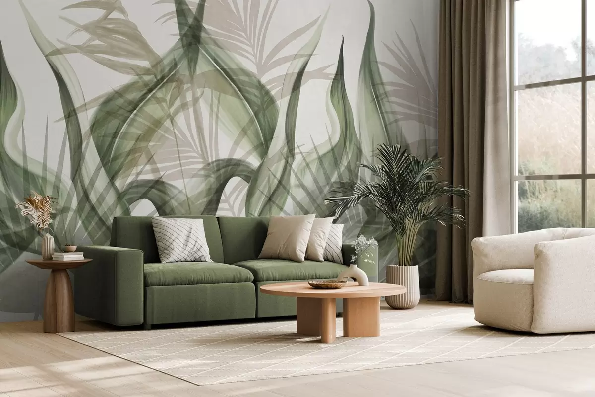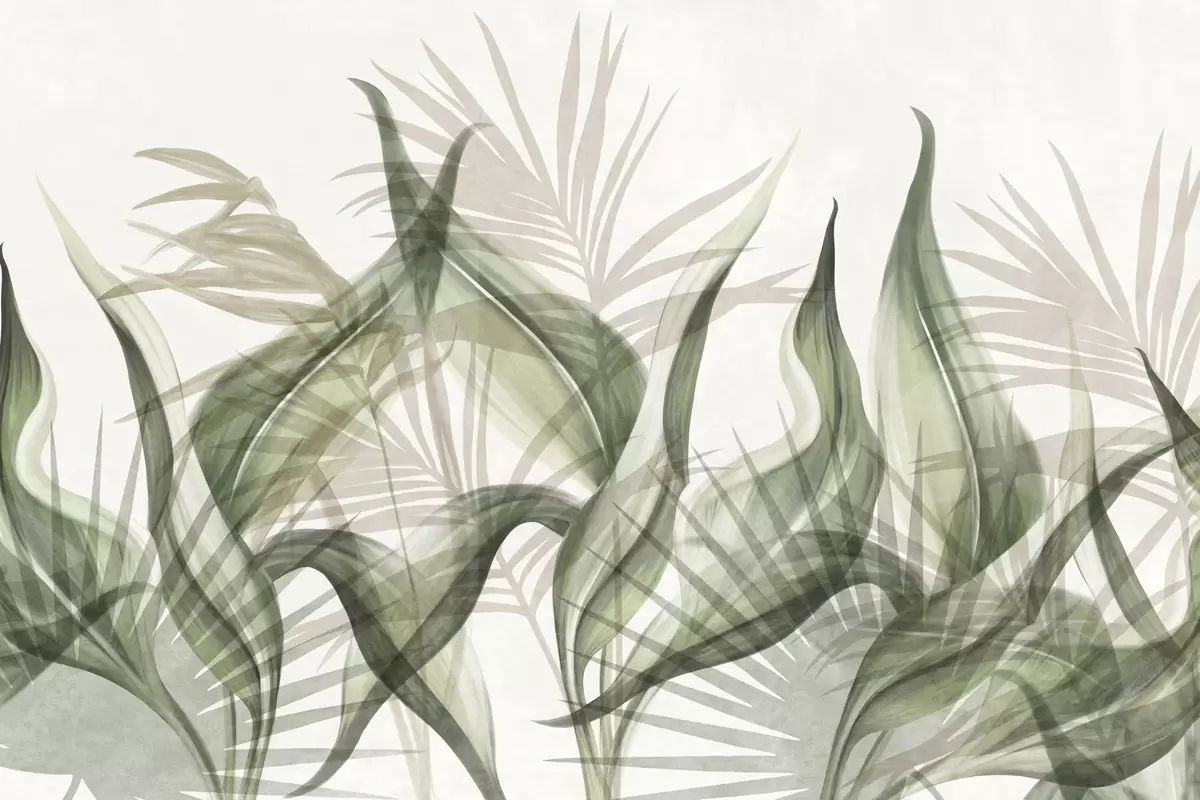 Fotomurales Hojas tropicales en tonos beige y verde sobre fondo blanco, estilo acuarela con textura. Nr. w09772v1