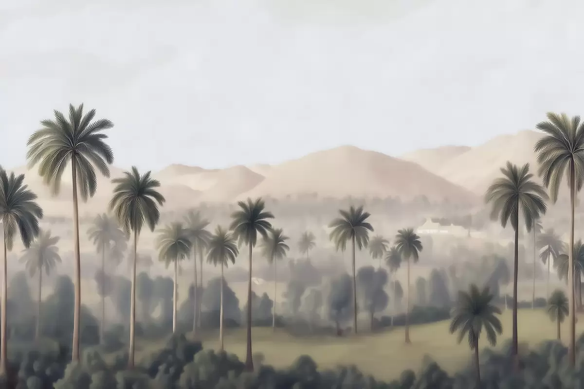 Fotomurales Paisaje tropical con palmeras y montañas, panorámica de estilo vintage en tonos beige y verdes Nr. w09798
