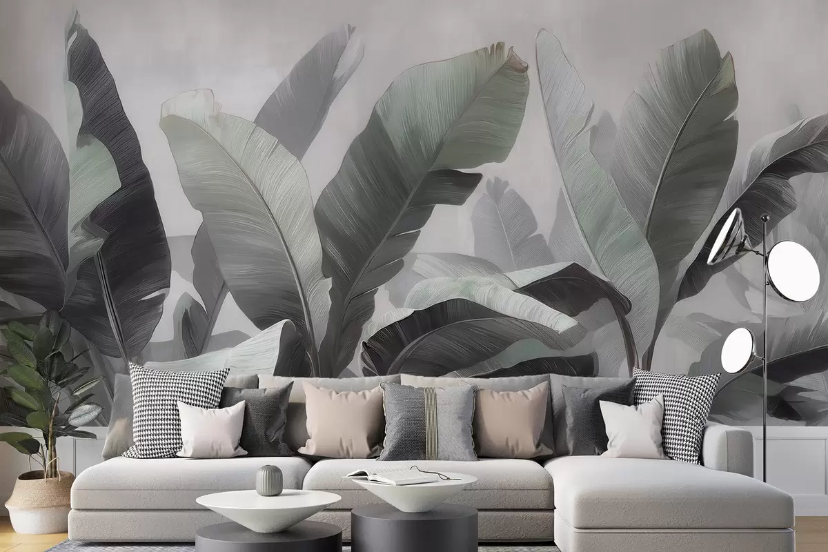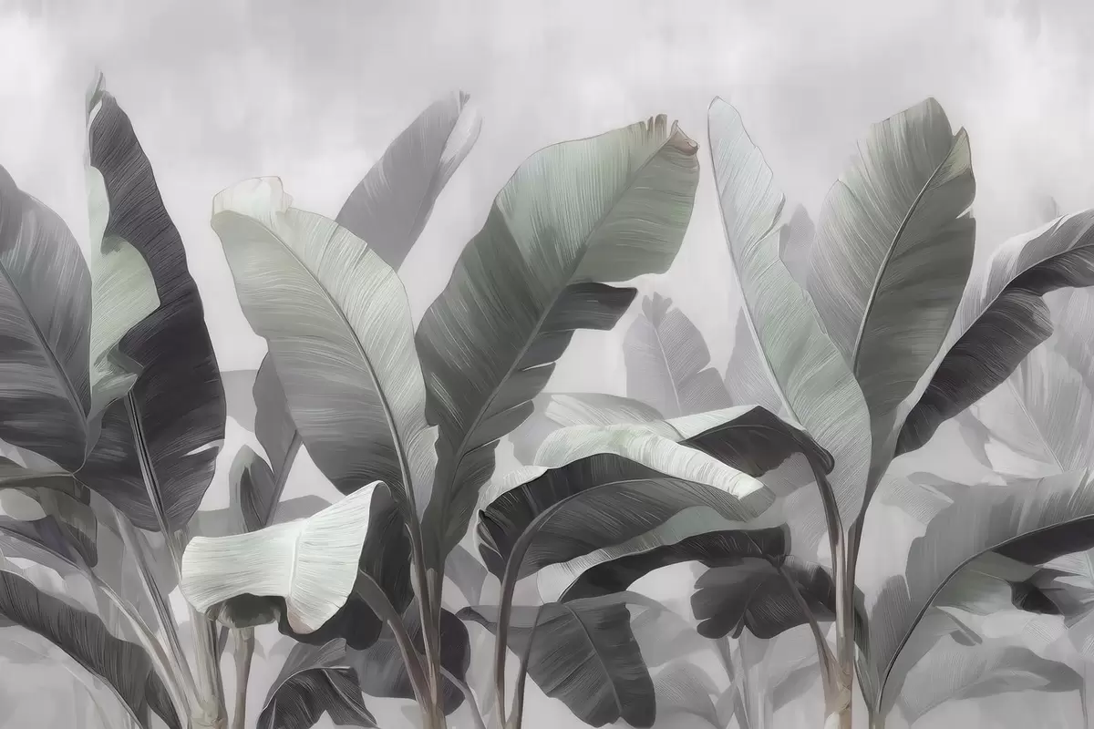 Fotomurales Hojas de plátano tropicales de gran tamaño en una paleta neutra con suaves tonos gris verdosos Nr. w09805