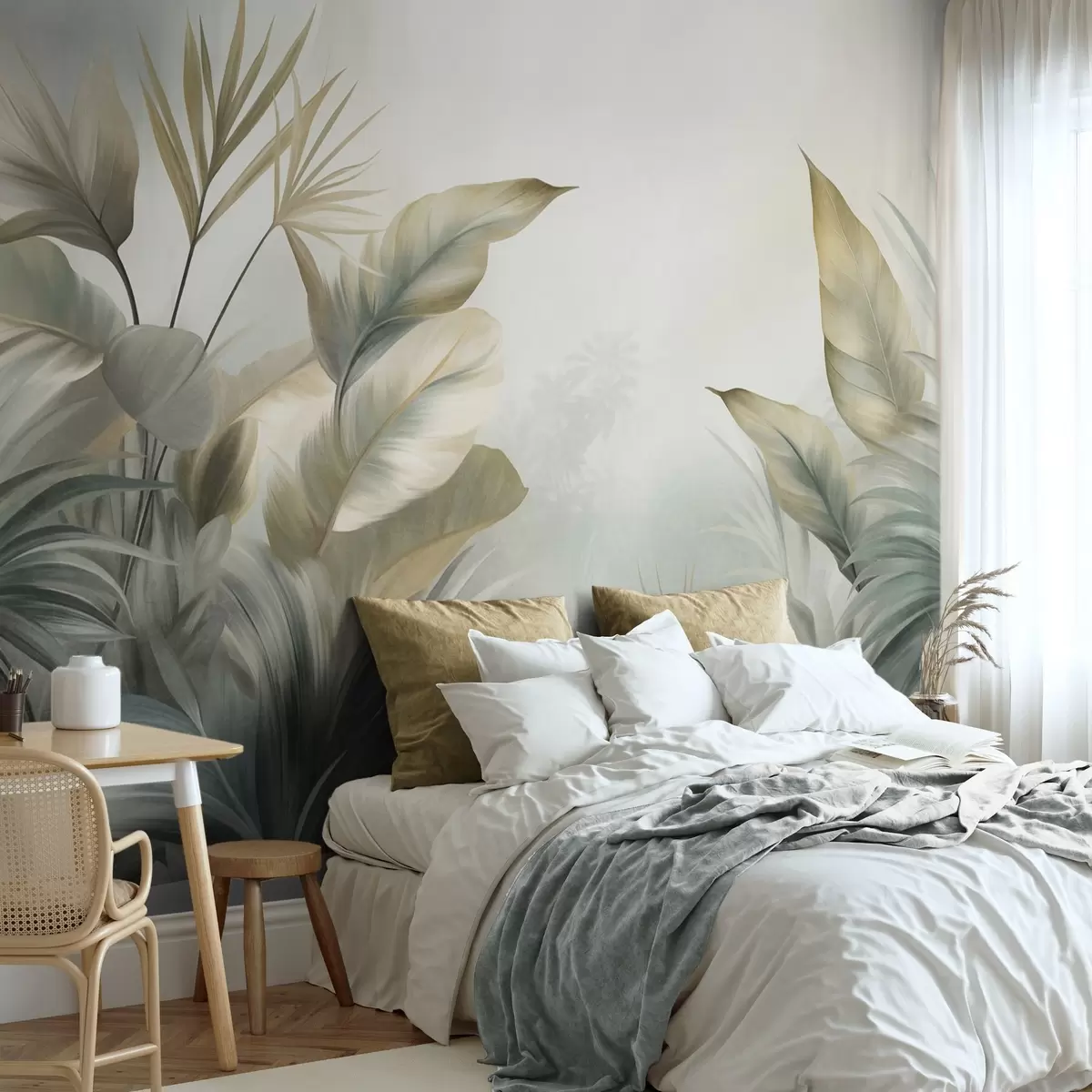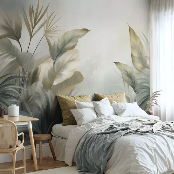 Fotomurales Hojas tropicales grandes y con textura en tonos apagados de verde y beige, un ambiente selvático Nr. w09820