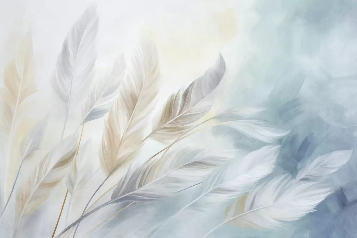 Fotomurales Plumas en tonos pastel con textura y bordes suaves y difuminados, sobre un fondo de estilo acuarela Nr. w09833