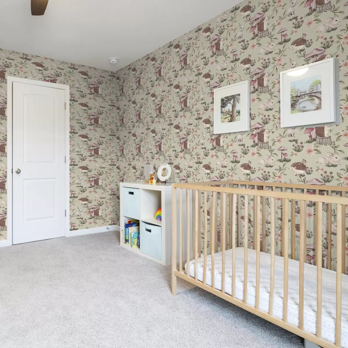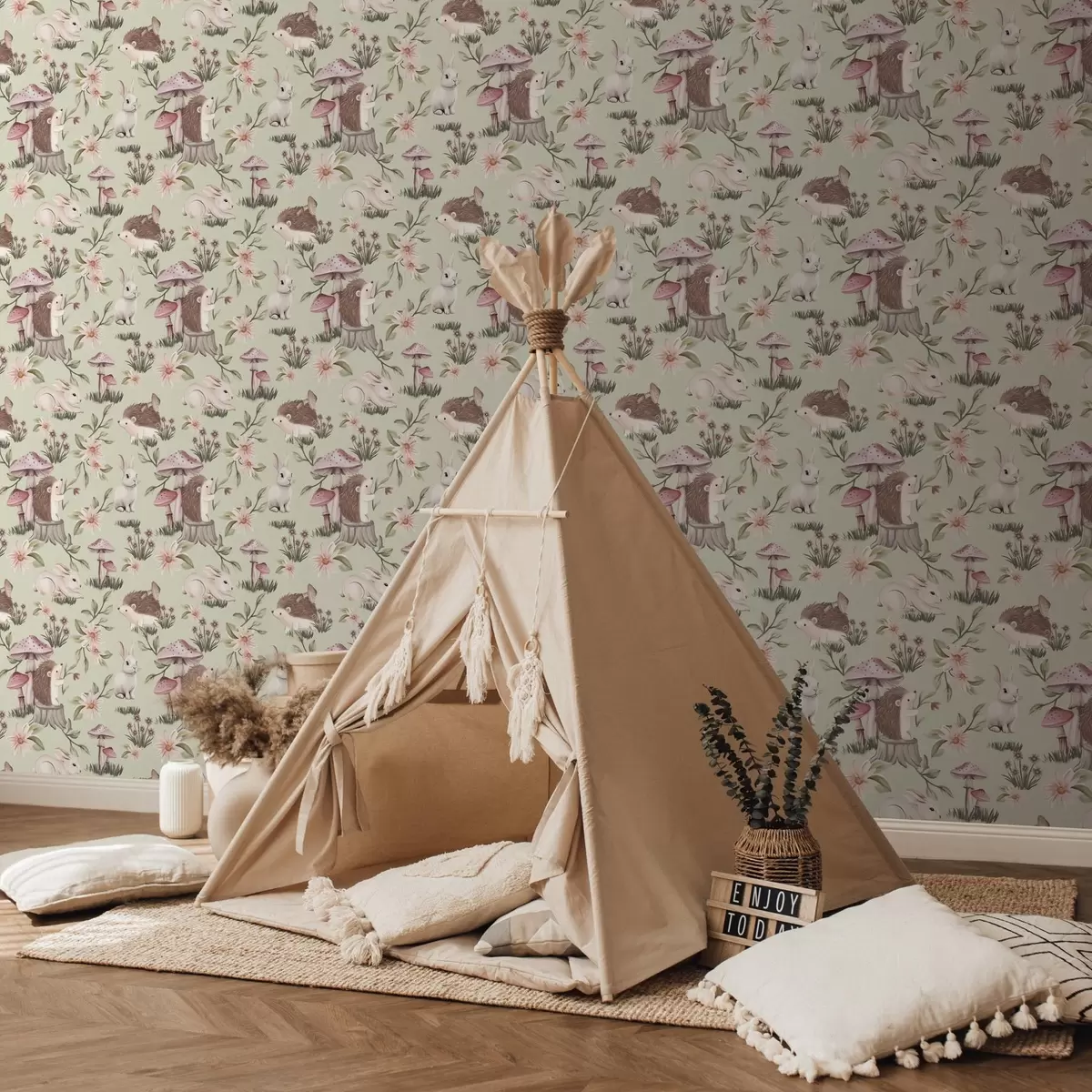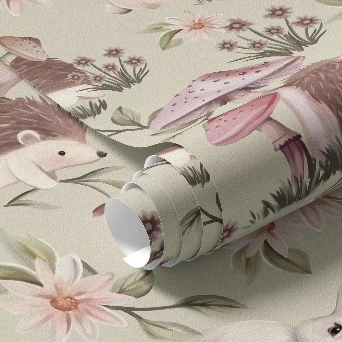 Papel tapiz Animales y flores de cuento sobre fondo verde en delicados colores pastel Nr. a00111v1