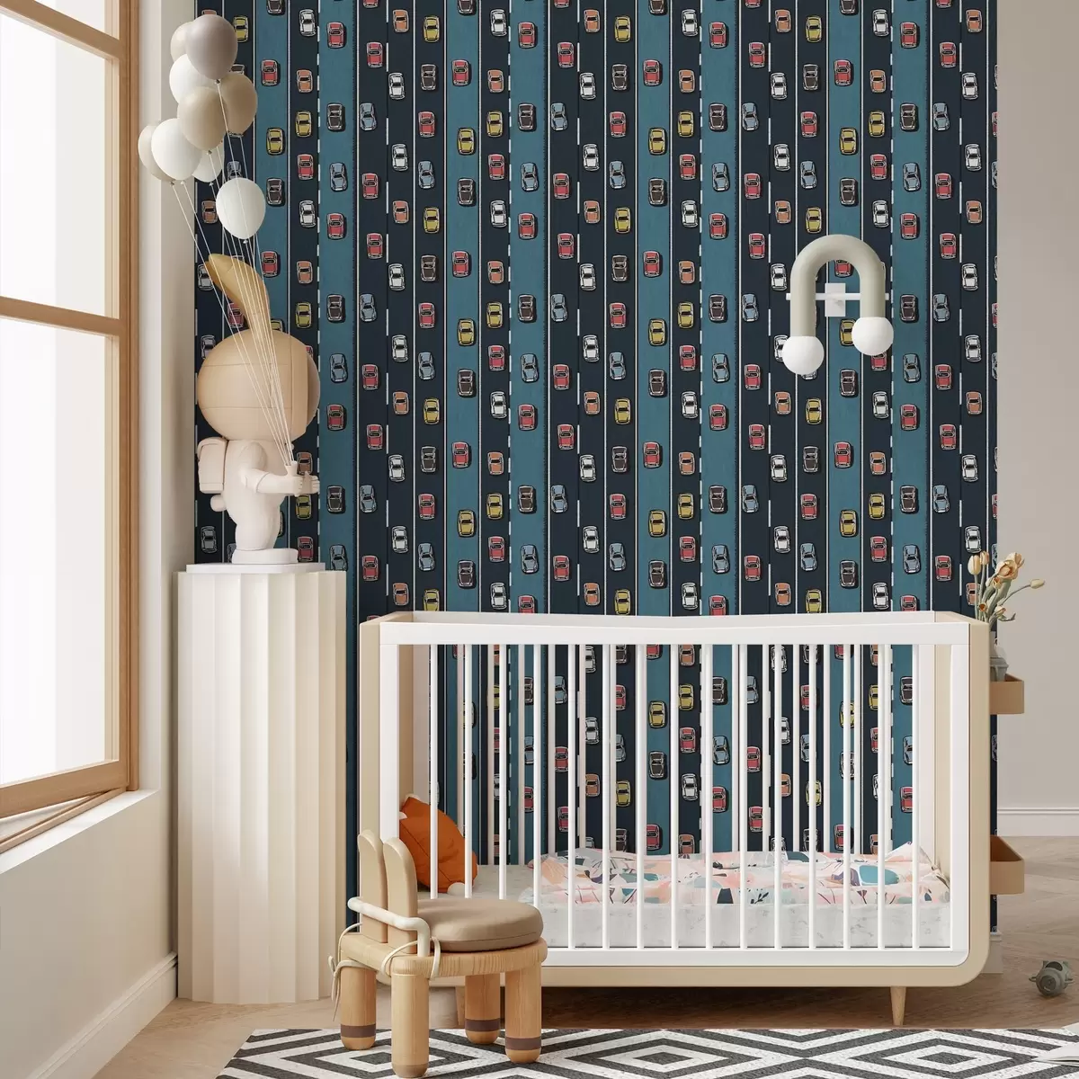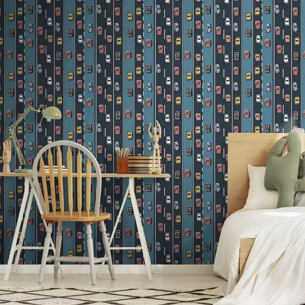 Papel tapiz Coche retro en carretera azul marino al estilo de los años 60 Nr. a00118