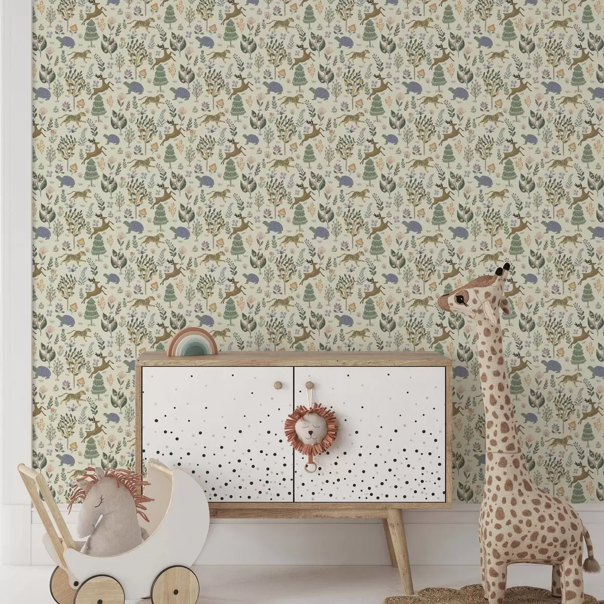 Papel tapiz Ilustración retro con leopardos, árboles y ciervos Nr. a00184
