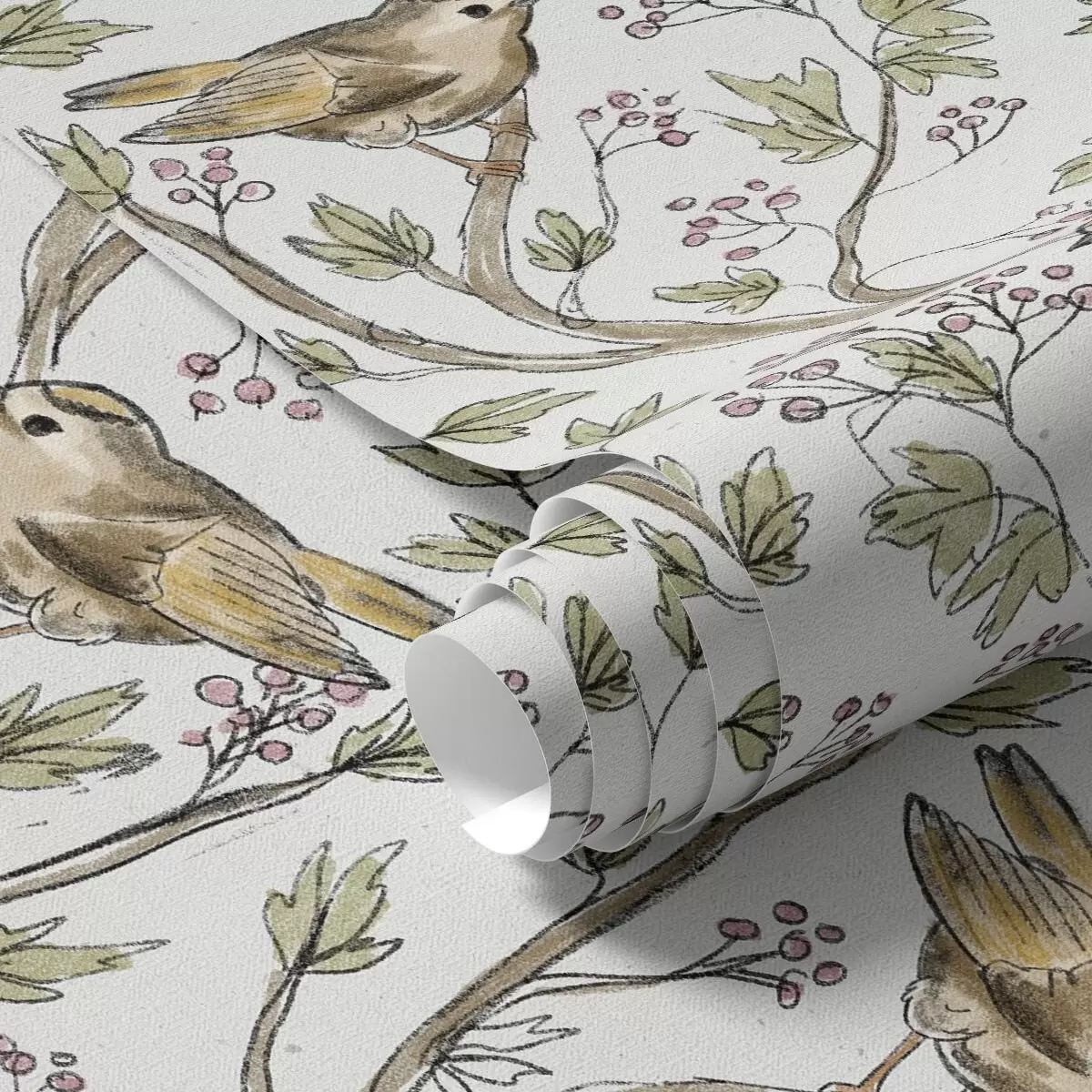 Papel tapiz Pájaros sobre ramas con hojas y bayas sobre fondo blanco Nr. a00283