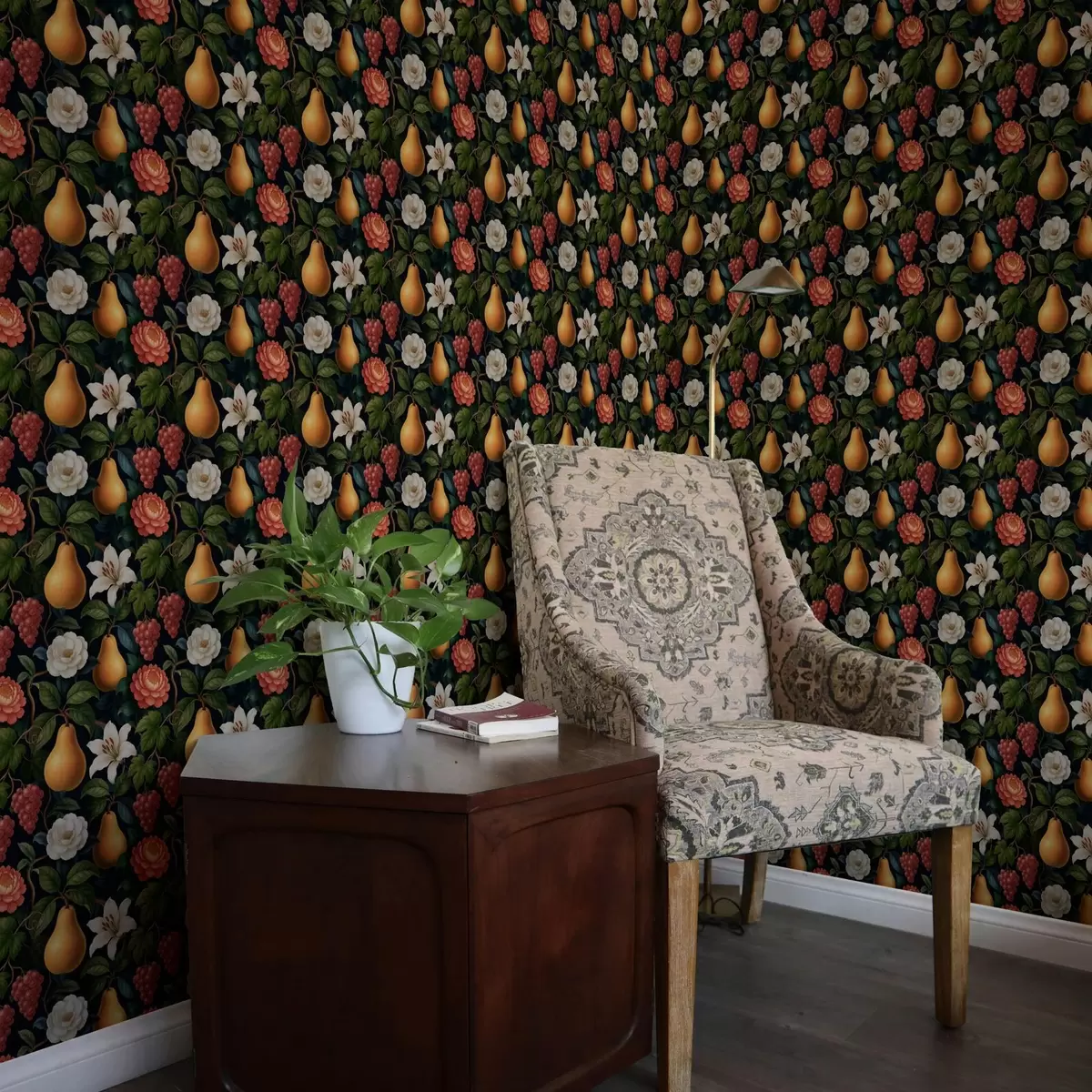Papel tapiz Frutas y flores barrocas sobre un dramático fondo oscuro Nr. a00387