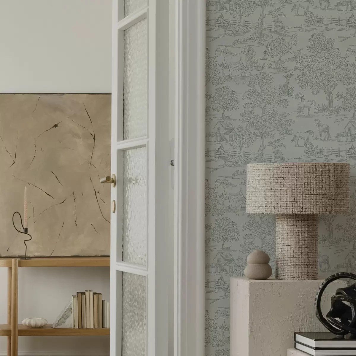 Papel tapiz Paisaje verde monocromo con caballos y casitas de campo Nr. a00407