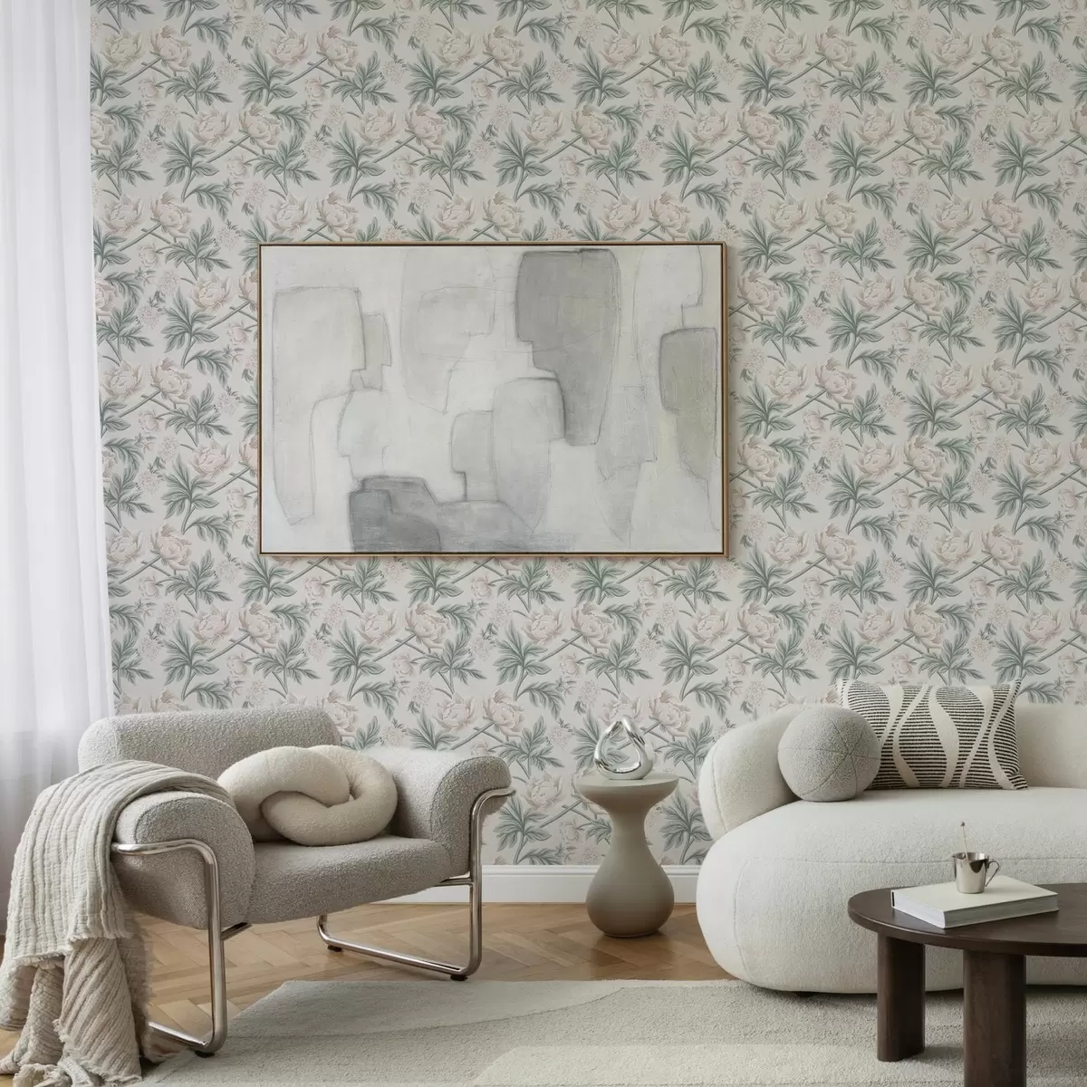 Papel tapiz Exuberantes peonías en beige claro y verde beige y verde Nr. a00445