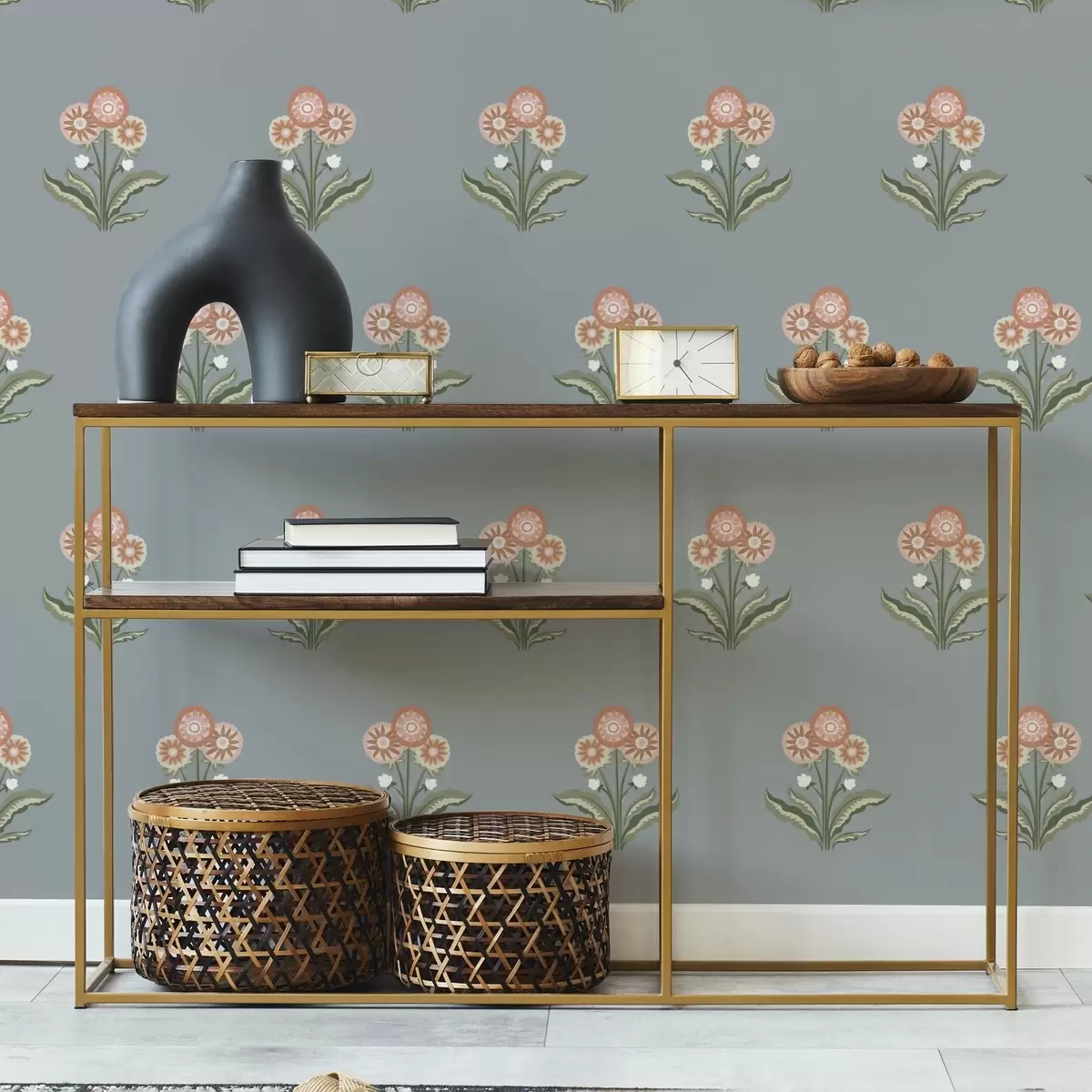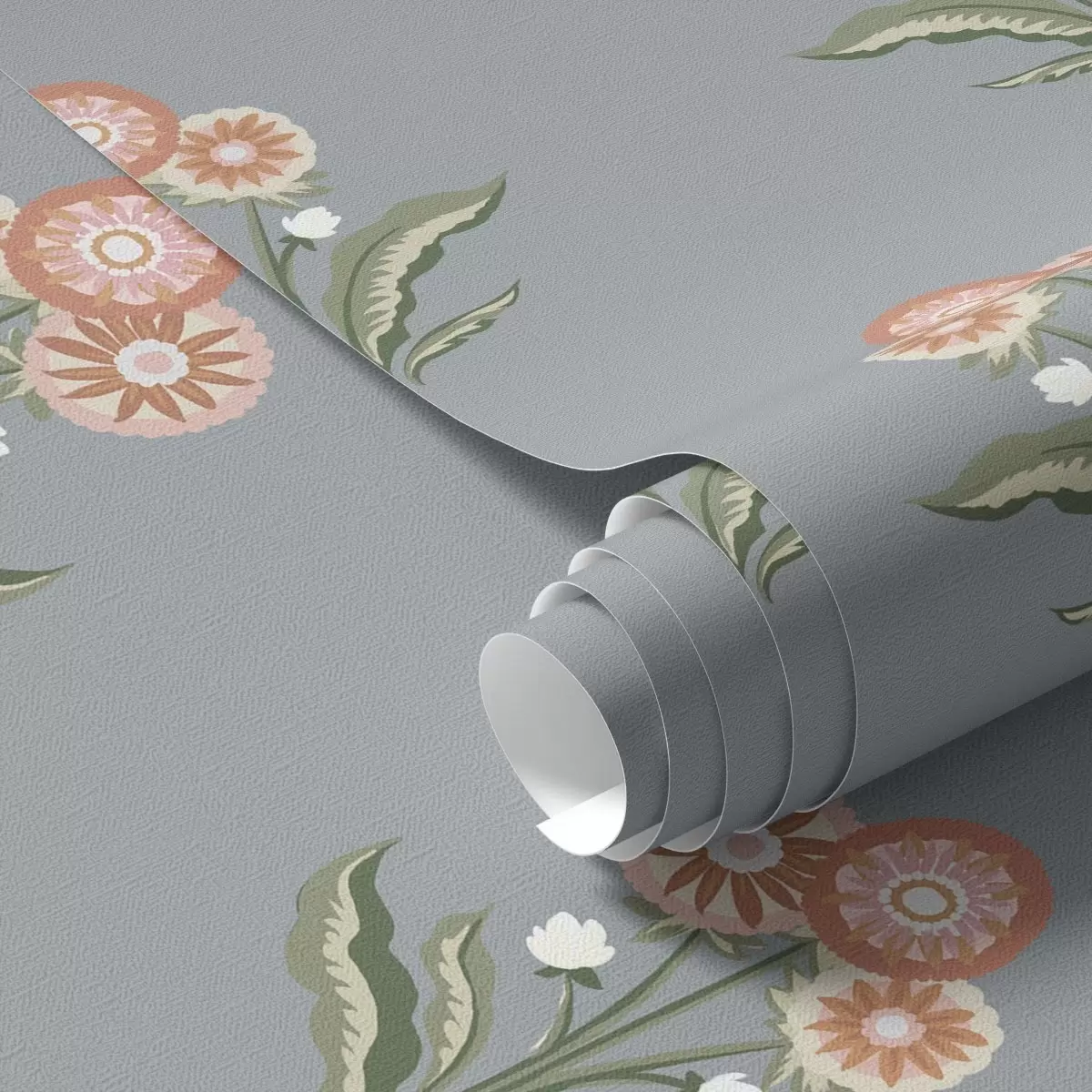 Papel tapiz Flores estilizadas sobre fondo gris azulado, paleta cálida Nr. a00494