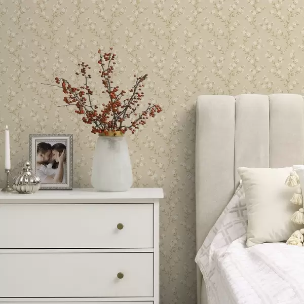 Papel tapiz Pequeñas ramitas blancas sobre un fondo de lino beige Nr. a00584