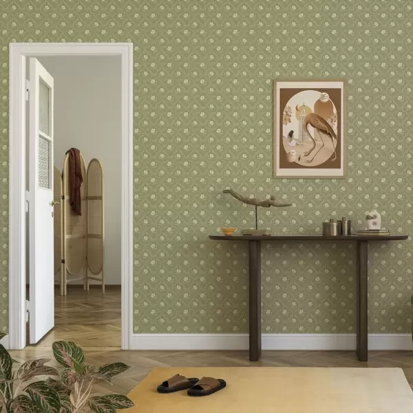Papel tapiz Enrejado de olivo con flores color crema, adorno retro Nr. a00585