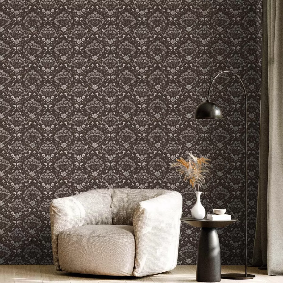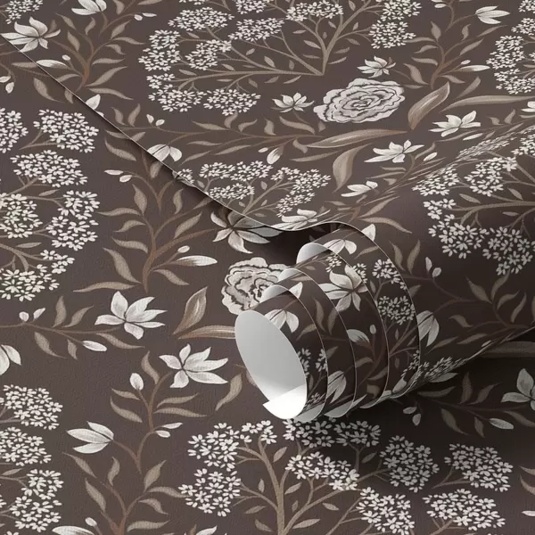 Papel tapiz Damasco de chocolate negro con peonías y campanillas de invierno Nr. a00603v2