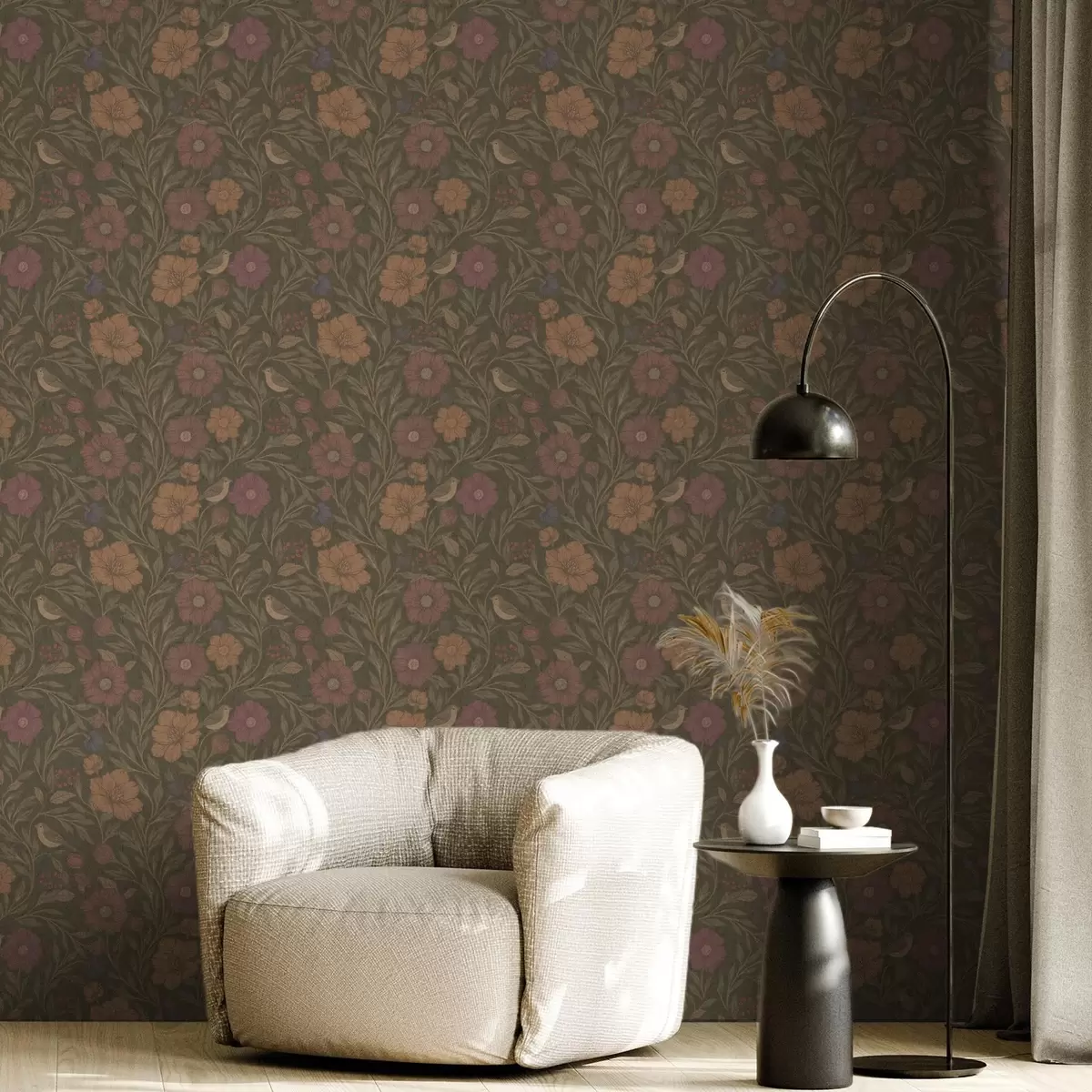 Papel tapiz Flores otoñales y pájaros sobre fondo marrón oliva Nr. a00605