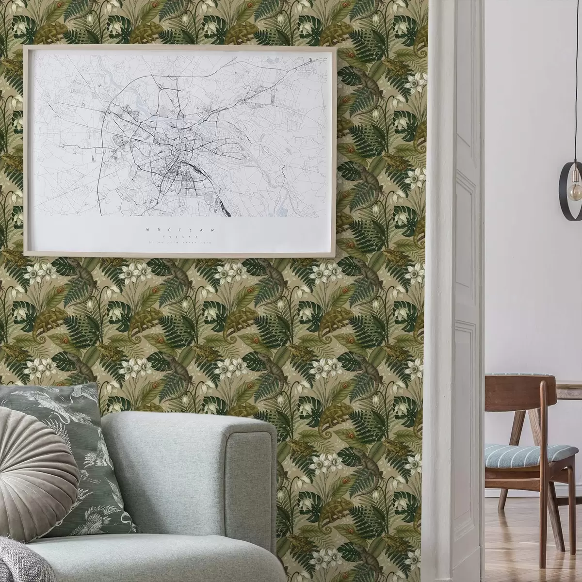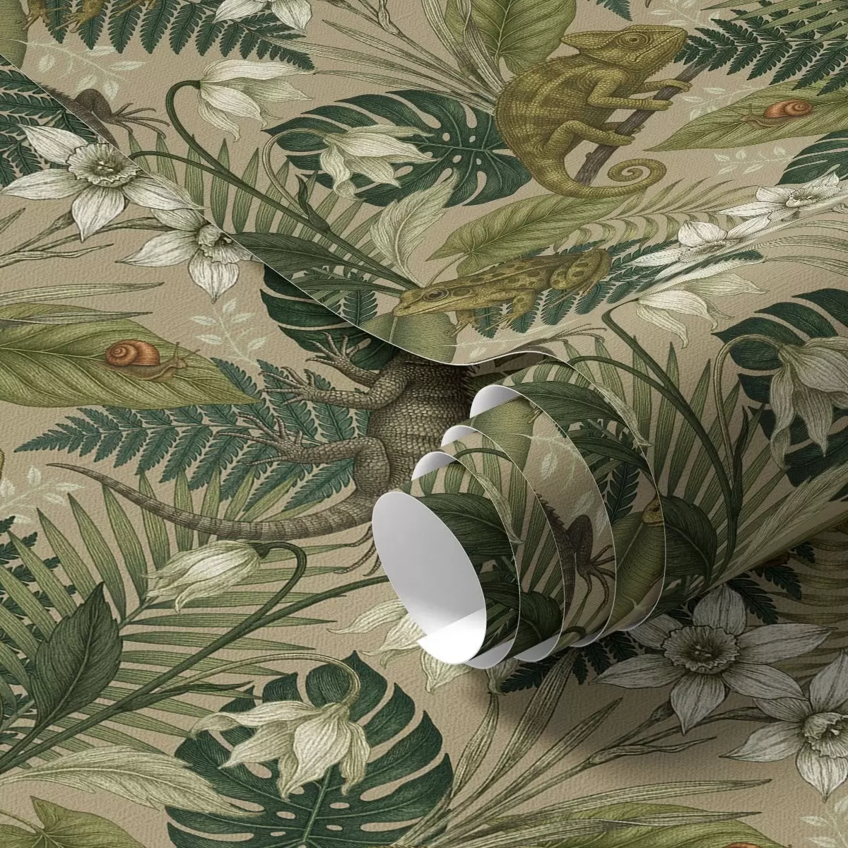 Papel tapiz Camaleones y hojas tropicales, flores blancas, fondo beige Nr. a00608