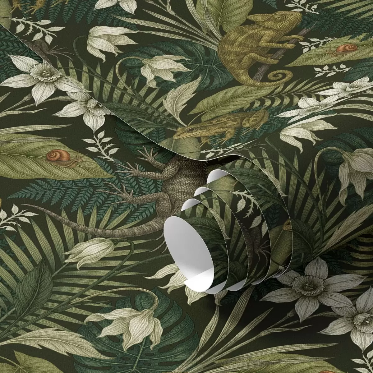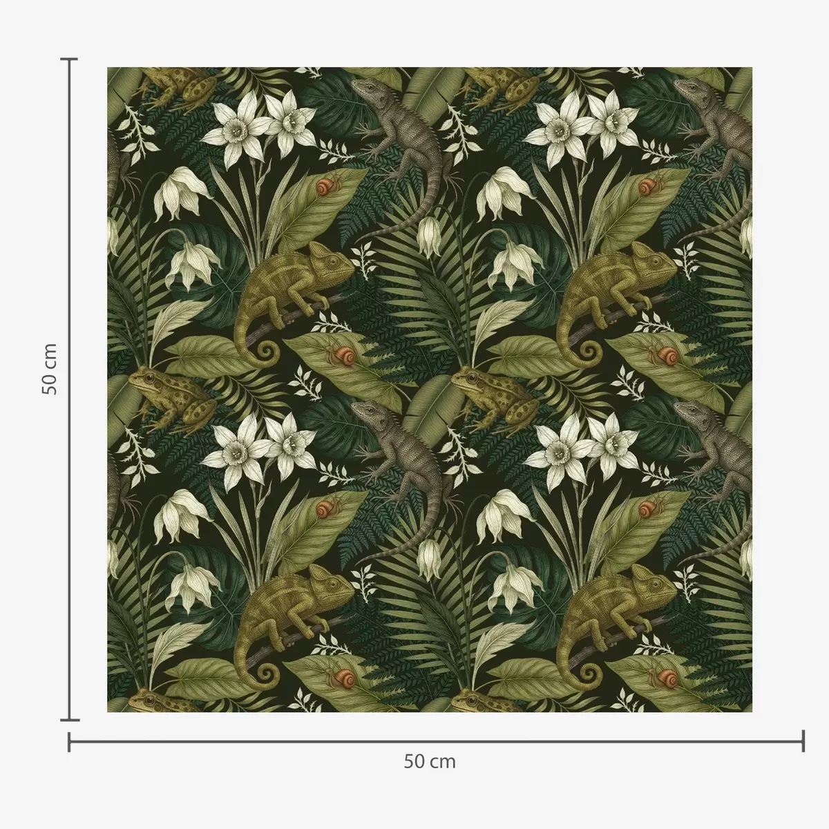 Papel tapiz Camaleones y hojas tropicales, flores blancas, fondo oscuro Nr. a00608v1