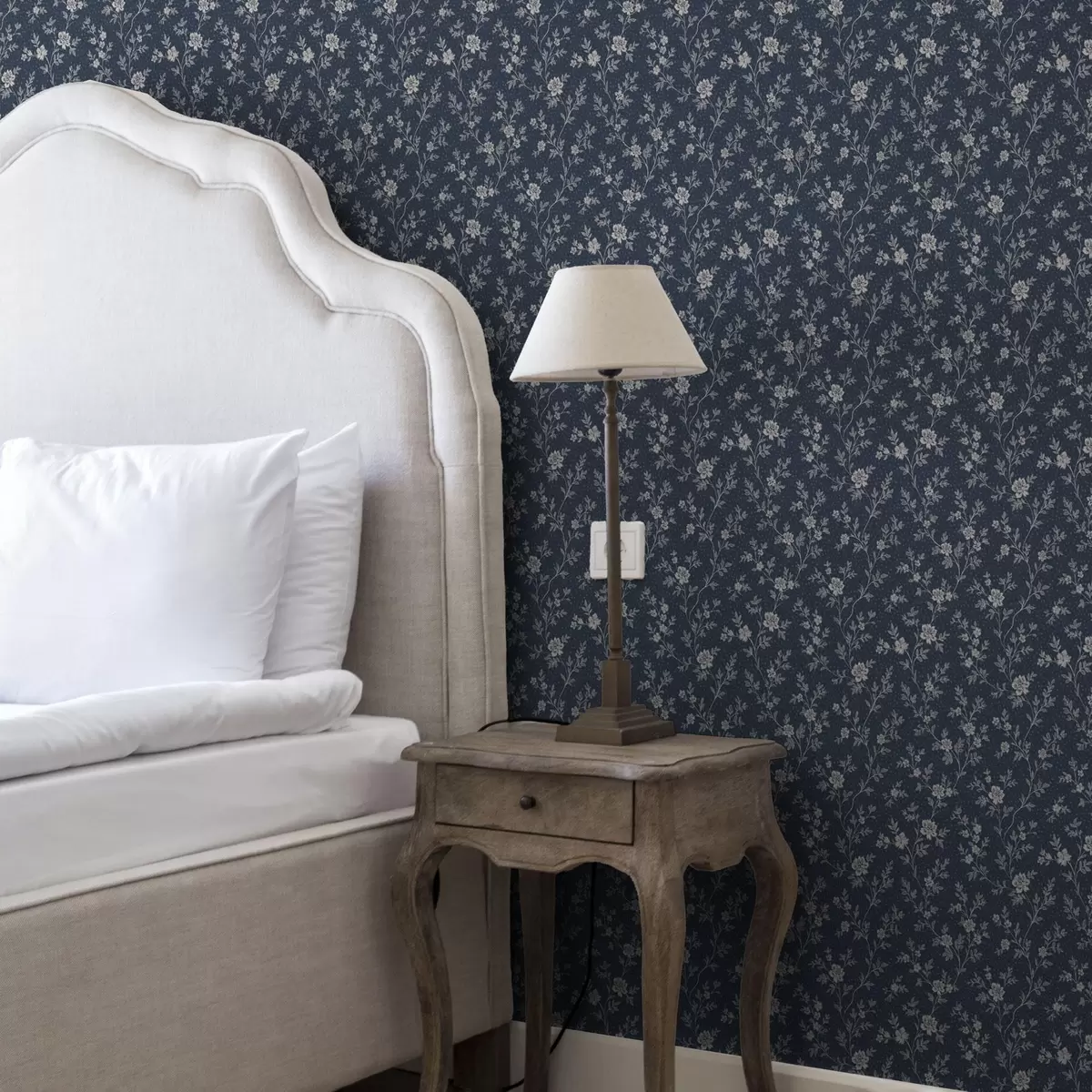 Papel tapiz Fondo azul marino oscuro con finas ramas y flores de color beige Nr. a00612
