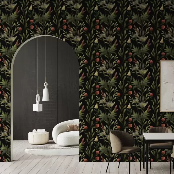Papel tapiz Hierbas altas y flores sobre fondo negro, estampado detallado Nr. a00620