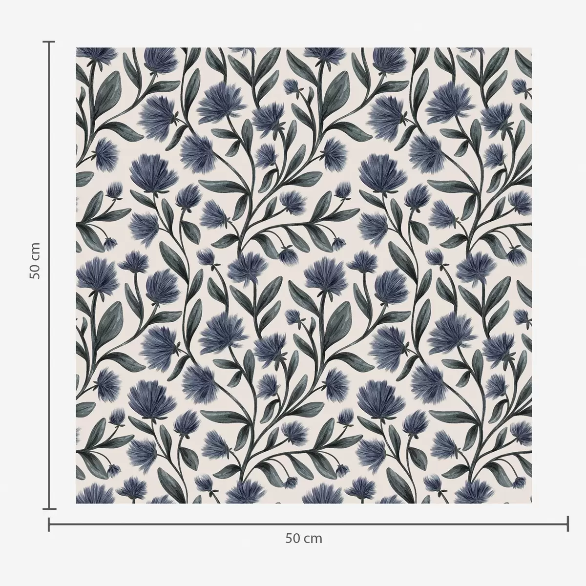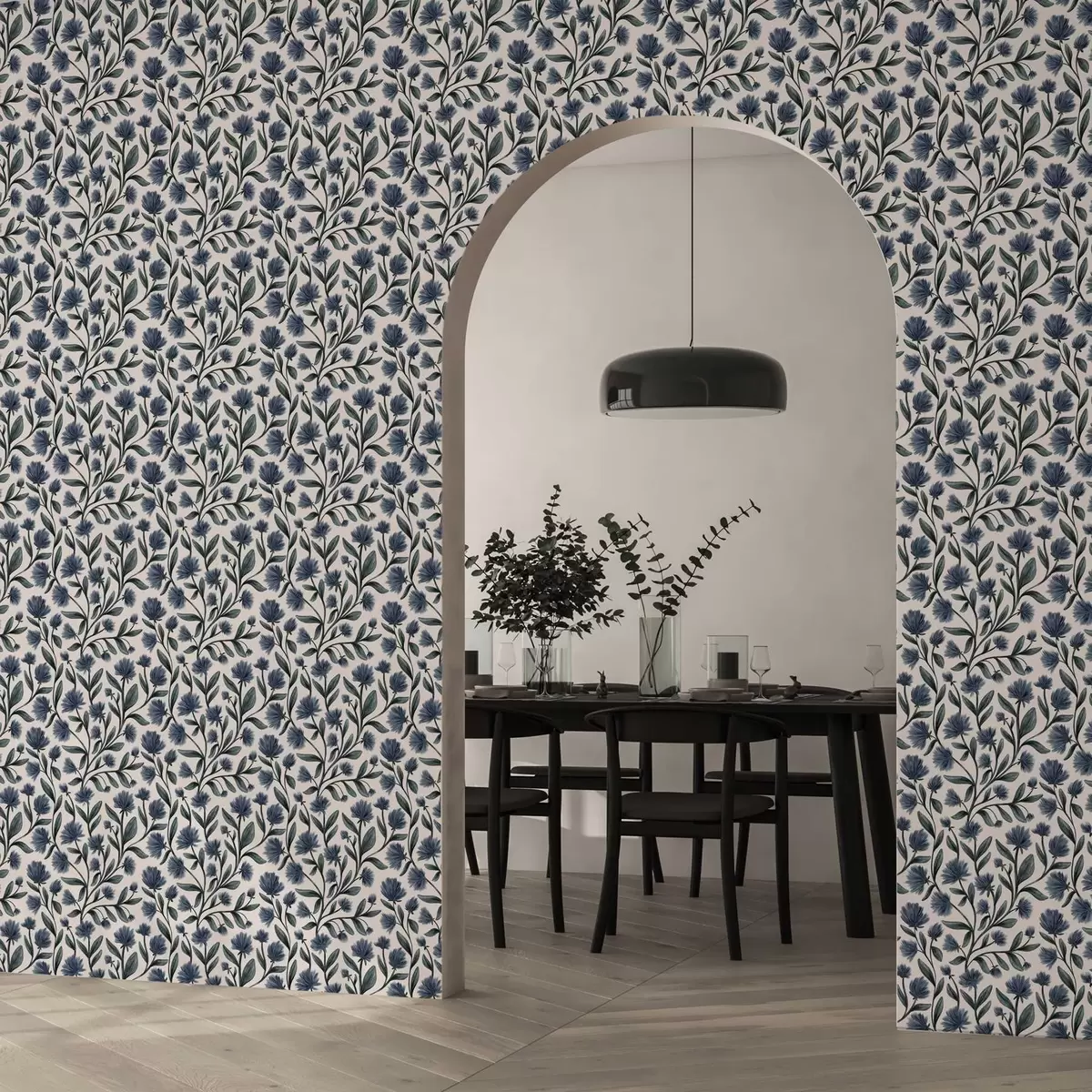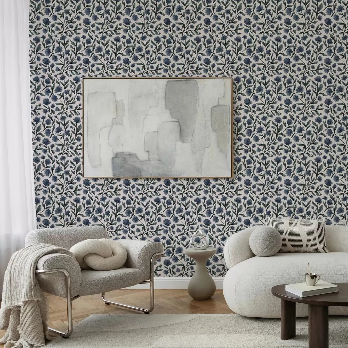 Papel tapiz Flores silvestres en una paleta de colores azul verdosos sobre un fondo crema Nr. a00623v2
