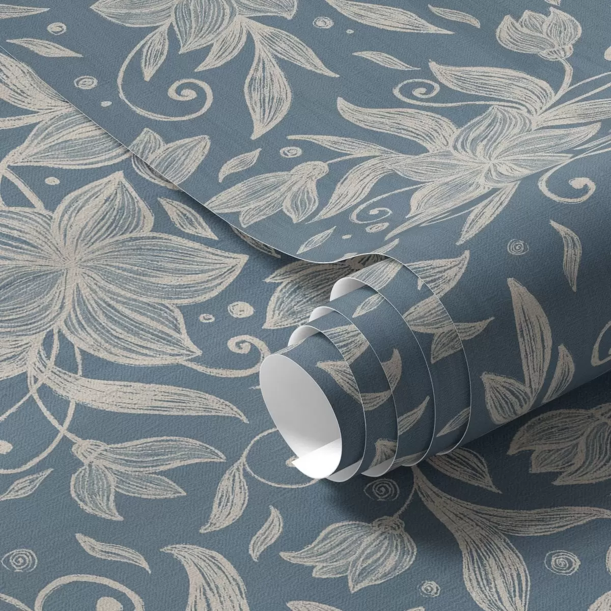Papel tapiz Flores lineales color crema sobre fondo azul, delicados arabescos Nr. a00630