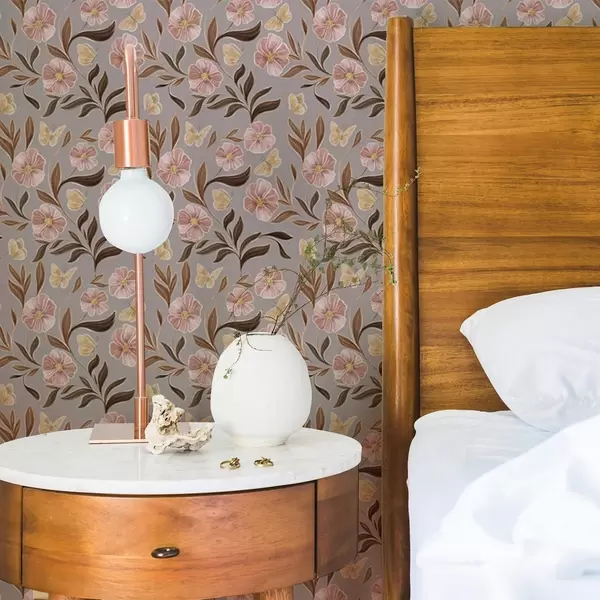 Papel tapiz Flores rosas y mariposas sobre un fondo gris-beige Nr. a00633