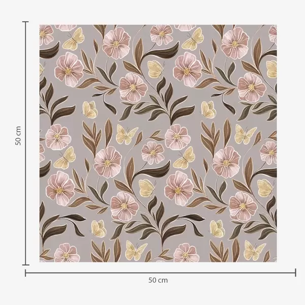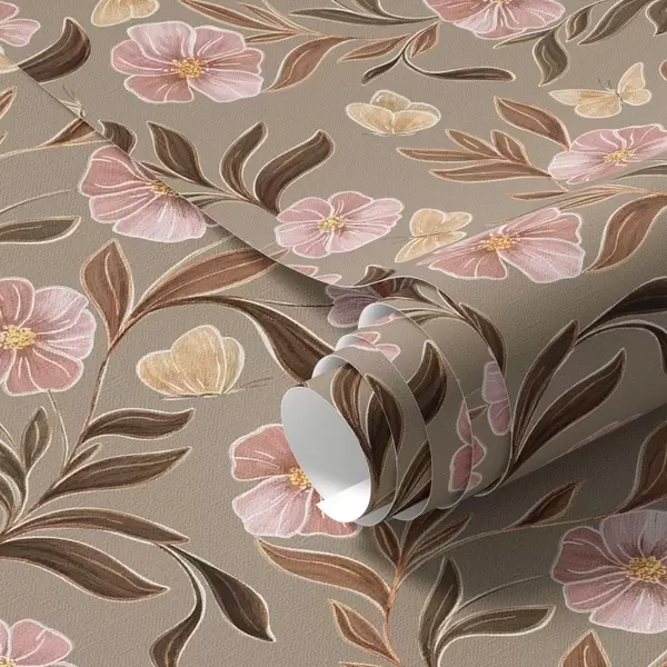 Papel tapiz Flores rosas y mariposas sobre fondo beige oliva Nr. a00633v2