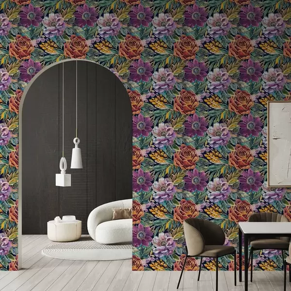 Papel tapiz Flores grandes y llamativas pintadas con pincel sobre un fondo azul oscuro Nr. a00643