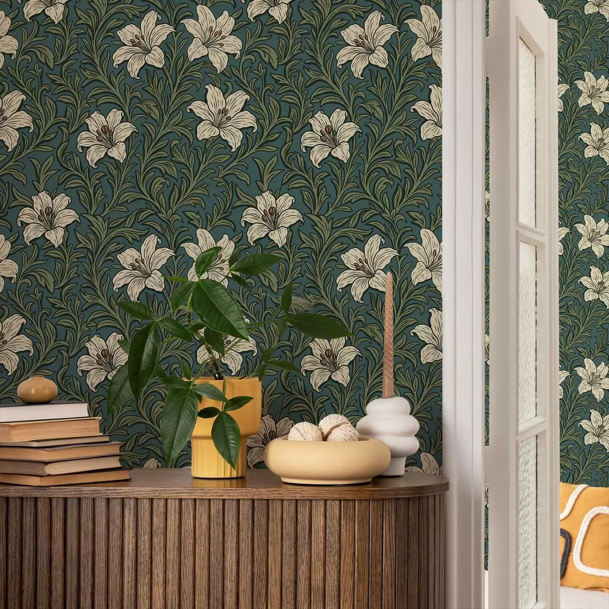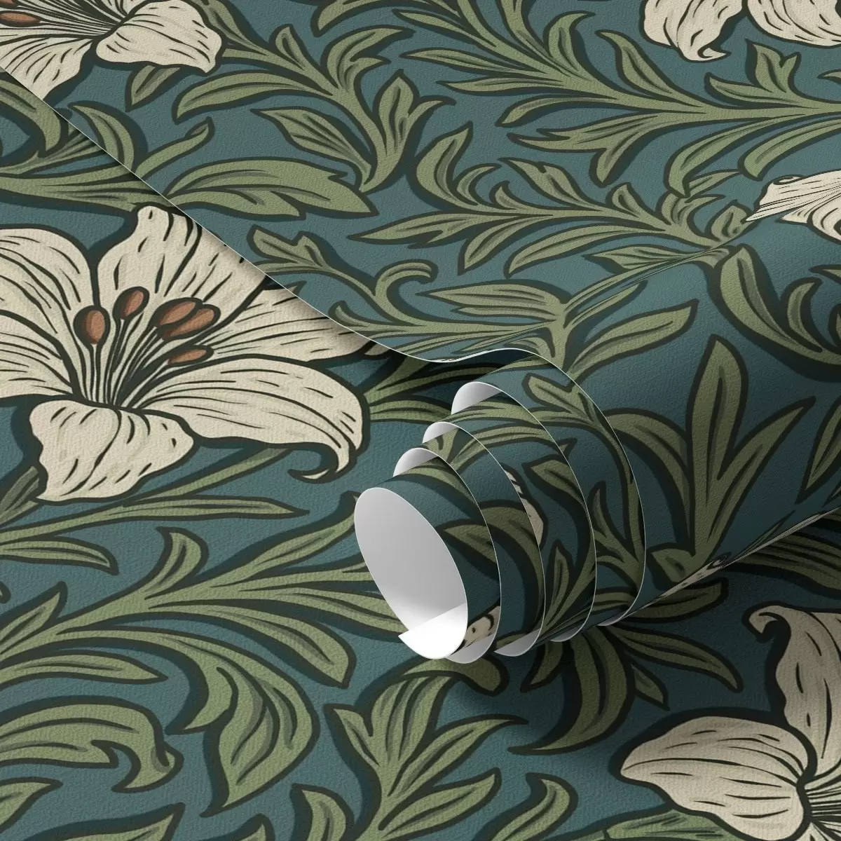 Papel tapiz Lirios crema entre una densa vegetación sobre un fondo turquesa Nr. a00645
