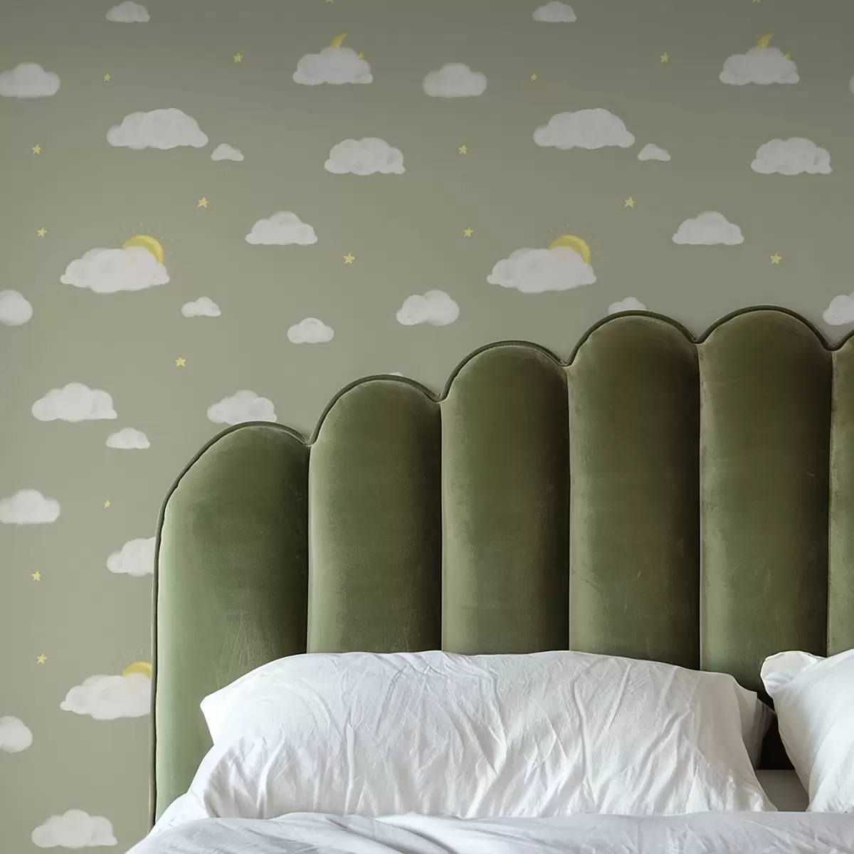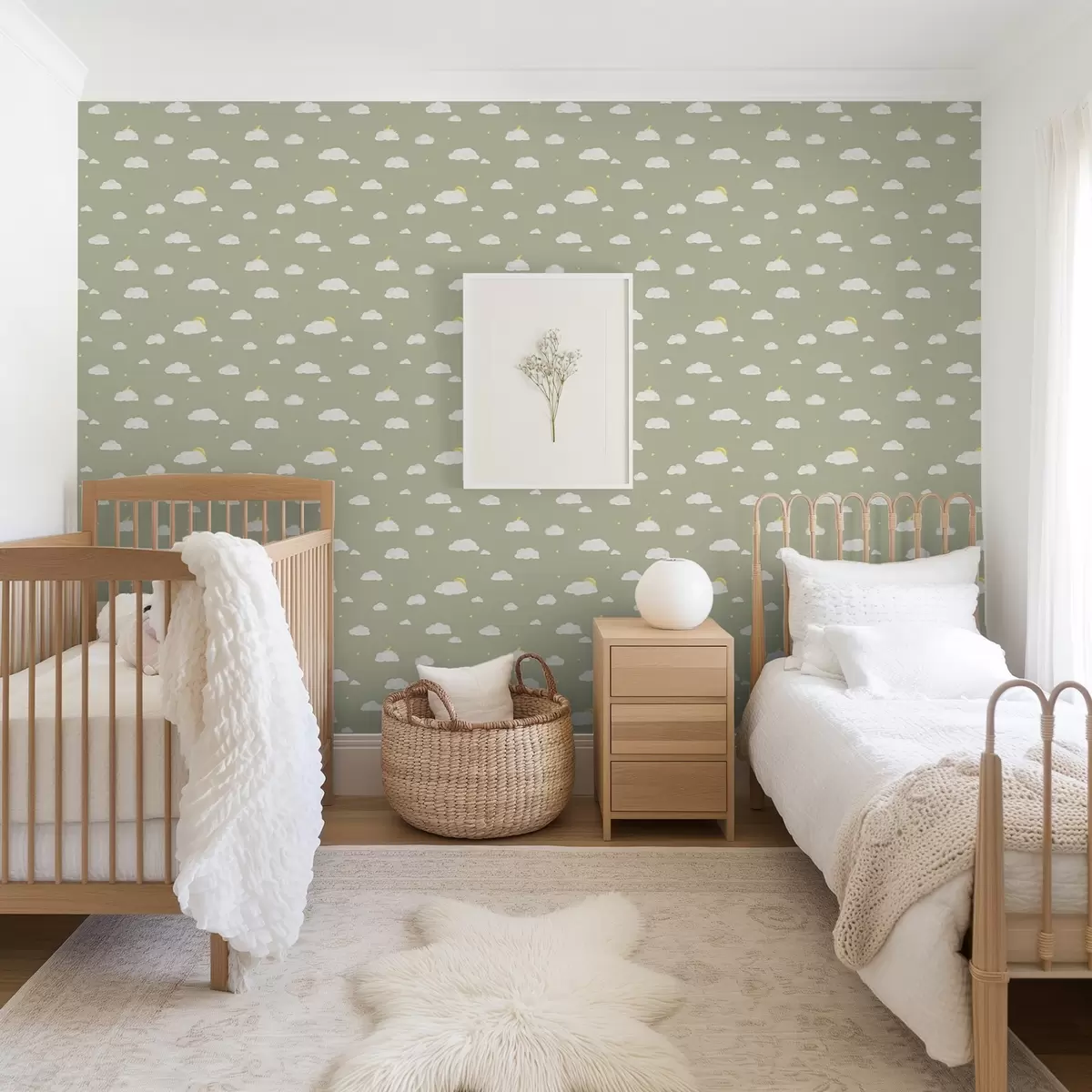 Papel tapiz Nubes suaves, estrellas y sol sobre un fondo gris verdoso Nr. a00652v1